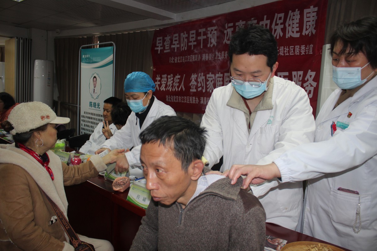 针对残疾人群体,江汉区残联志愿者与中医康复团队提供“一对一”陪检服务,运用艾灸、推拿等方式缓解病痛。