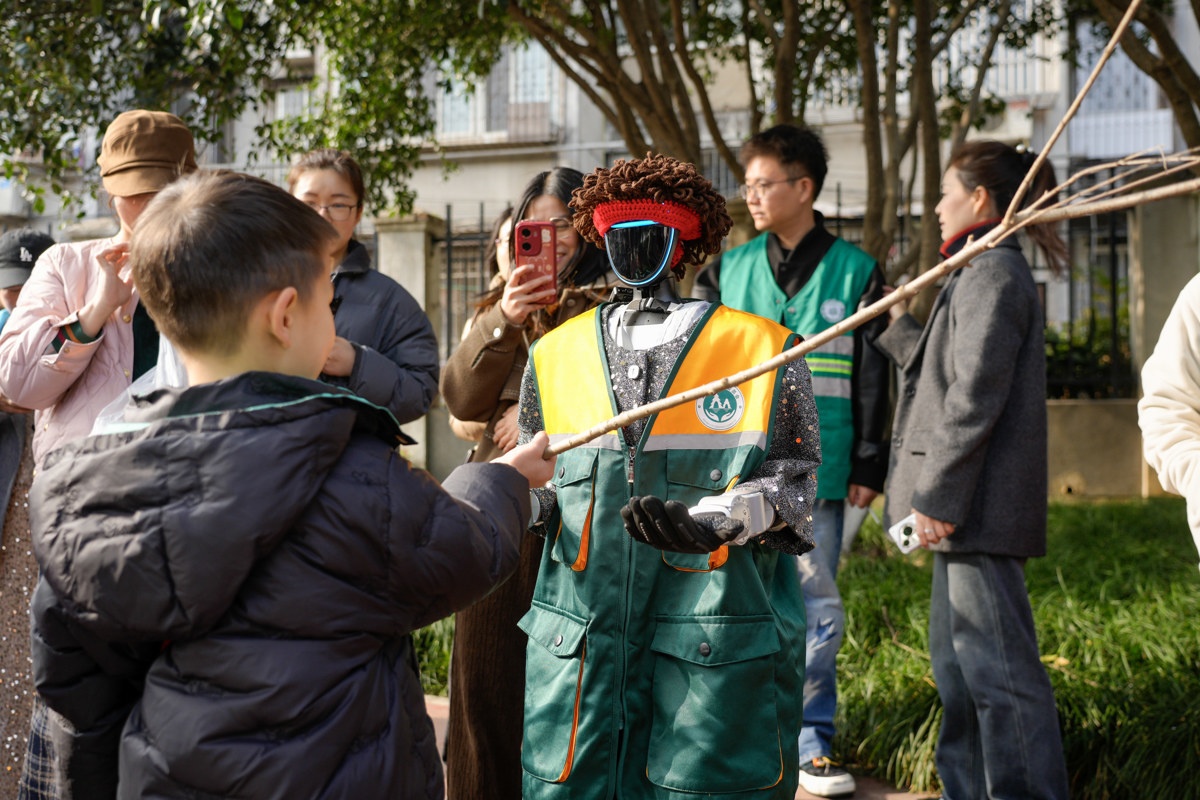 递上小树苗,讲解植树知识,武汉网红智能机器人豆皮与孩子们和市民一起,于3月7日在武昌紫阳公园植下新春新绿,引人关注。