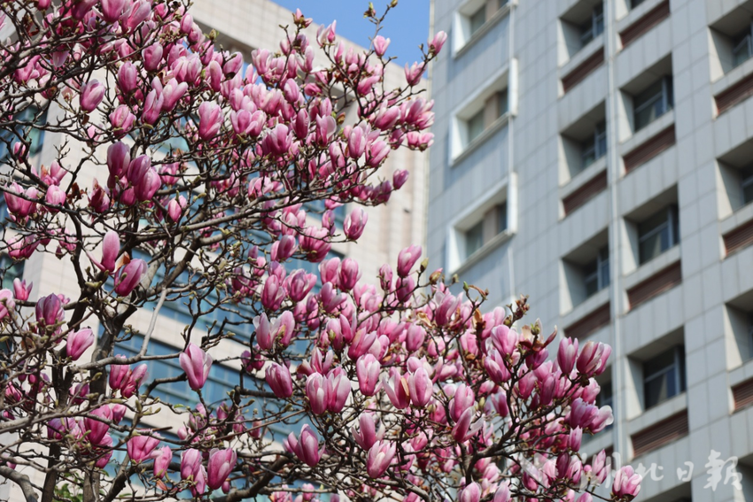 目光转向街头,文治街、团结大道部分路段化身“玉兰大道”。一树树玉兰迎风舒展,洁白花瓣透着淡粉,紫艳中藏着清雅,在蓝天映衬下如云似雪,绵延成浪漫花廊。“无需远郊寻春,城市街头便是盛景。”路过文治街的刘先生感慨地说。驾车穿行其间,花香随风入窗,平日里的通勤路变成治愈之旅,尽显“车行花海、人游画中”的意境。