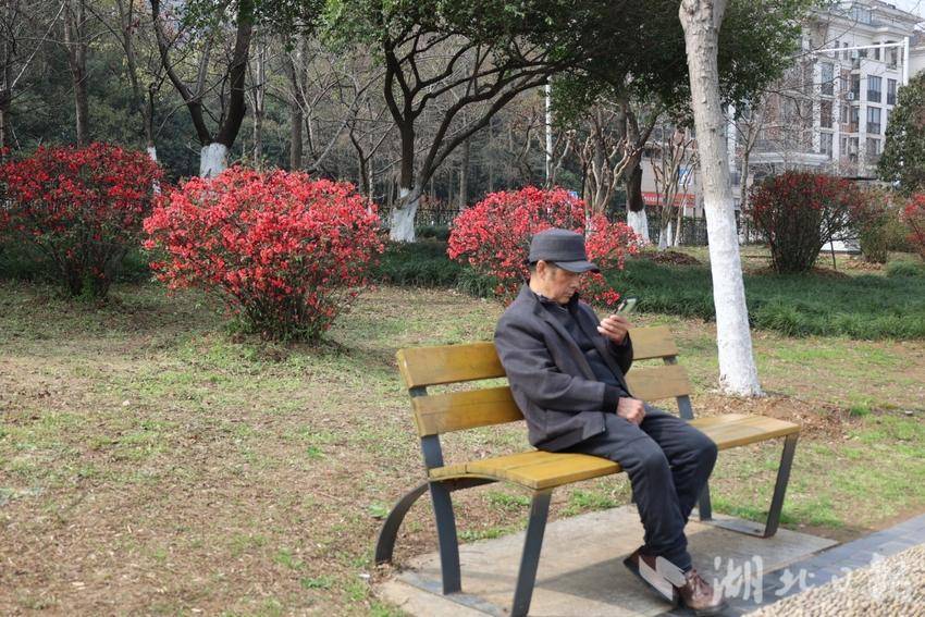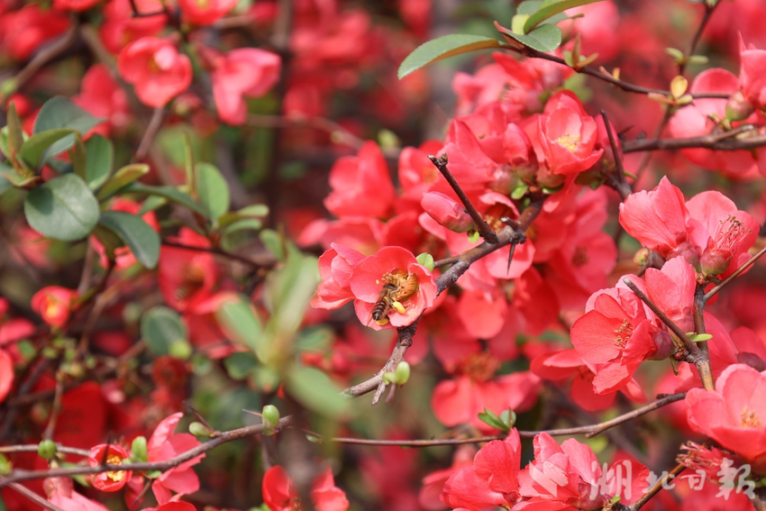 走进南湖幸福湾公园,贴梗海棠正值盛花期。球形树冠上,嫣红花朵紧贴枝干热烈绽放,金黄蕊心点缀其间,无需绿叶便自成景致。海棠与碧水清波相映,移步换景皆是画意。关山公园内,花团锦簇与茅草亭、栈道相融,勾勒出雅致城市花境。“天气晴好,来公园偶遇这片海棠,随手一拍都是大片!”市民艾女士欣喜地说。