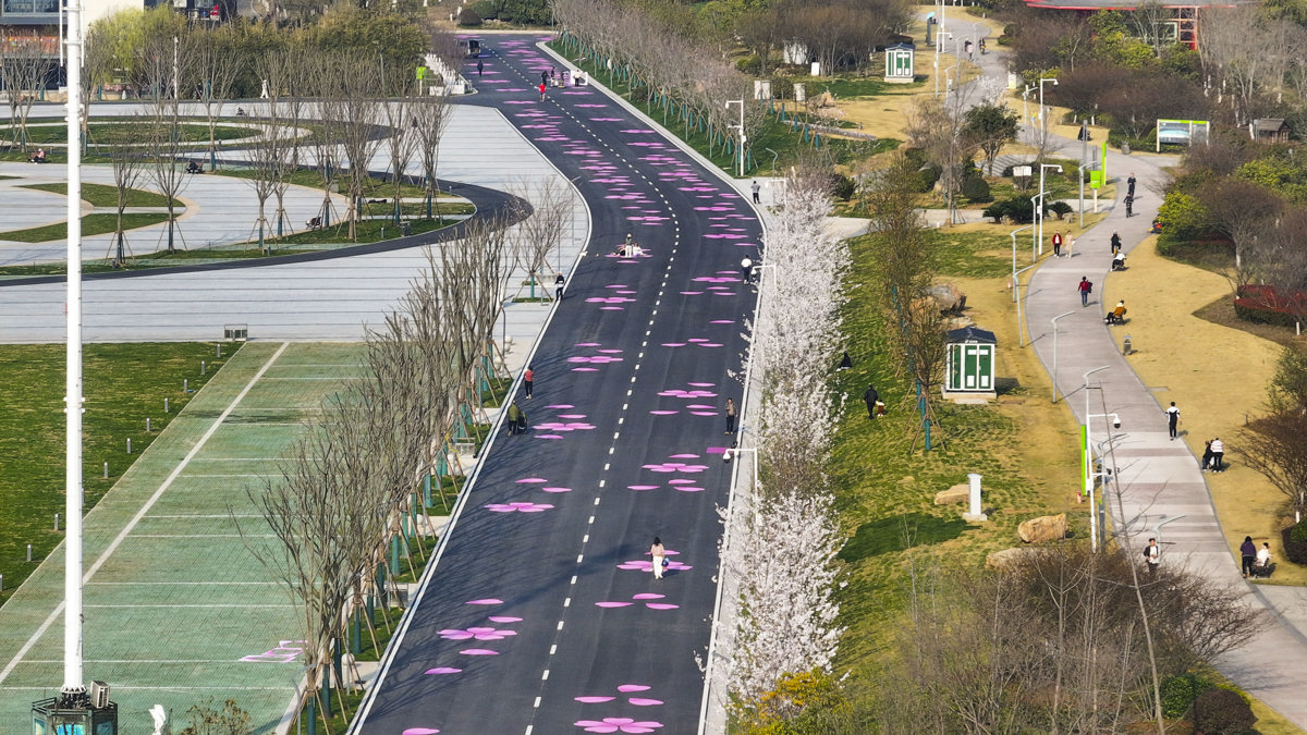 为了让跑者以最佳状态冲刺,冲刺道路拓宽至12米,宽敞平坦。长达760米的樱花大道两侧,60余株新植的樱花树亭亭玉立,地面上彩绘了78组樱花图案,奔跑其间,仿佛穿行于流动的花海之中。