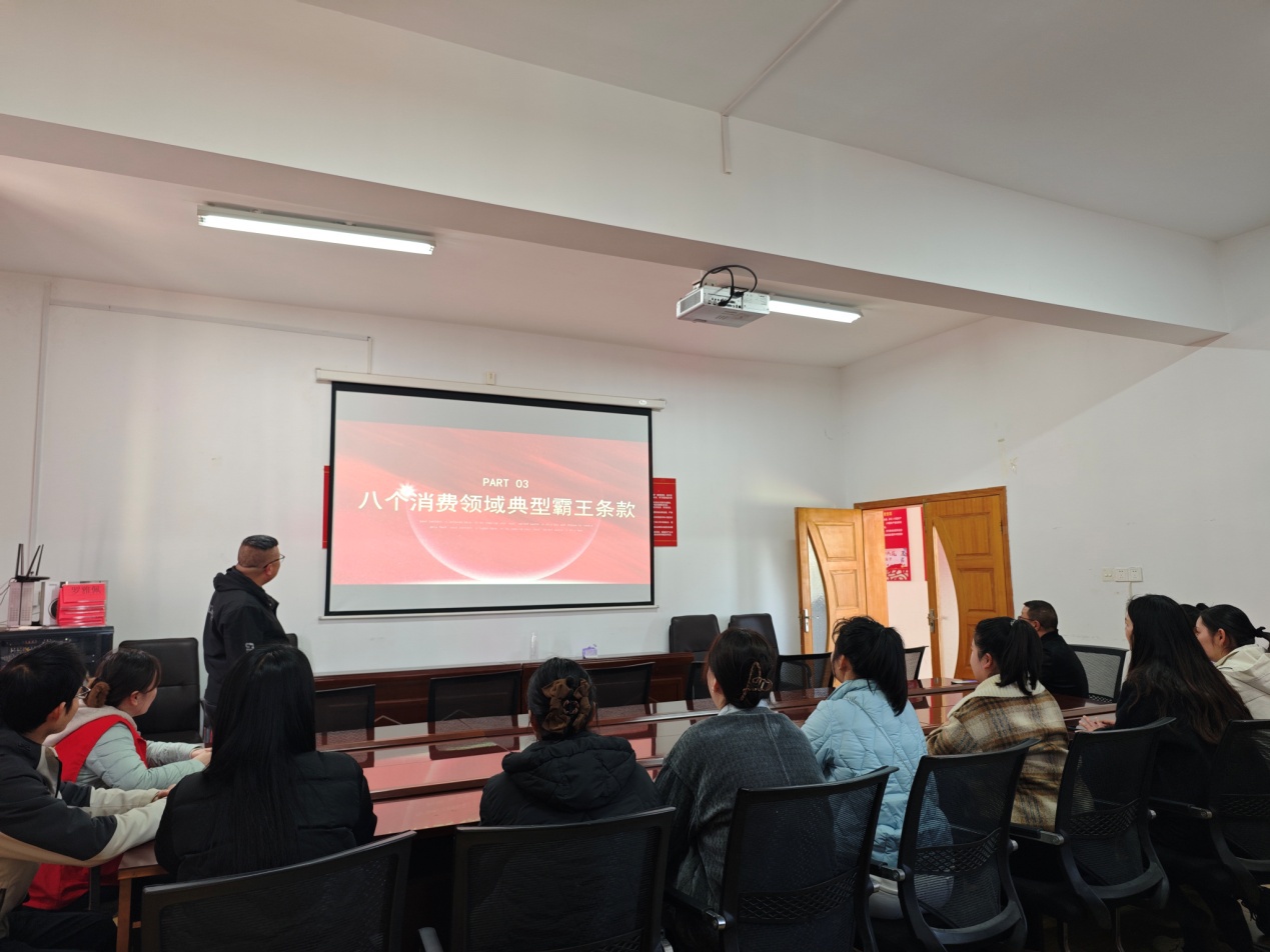 讲座现场,社区工作人员早早调试好投影设备,将精心制作的普法课件投放在幕布上。红色主题的背景板上,“八个消费领域典型霸王条款”“两法核心要点解读”等内容清晰醒目,为现场营造出庄重而温暖的普法氛围。主讲人结合居民日常消费场景,用通俗易懂的语言拆解电商购物、预付卡消费、餐饮服务等高频场景中的“霸王条款”,逐一剖析“概不退款”“最终解释权归商家所有”等违规条款的法律风险,现场演示如何识别、拒绝并依法维权;在“两法”宣传环节,工作人员重点解读基层群众自治组织的职能与居民权利义务,让大家明白社区治理与自身权益的紧密联系。