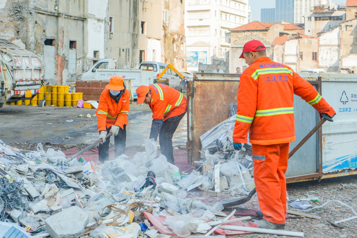 清理现场,志愿者与环卫人员手持扫帚、垃圾夹等工具,对场地内散落的塑料袋、果皮、废弃杂物等生活垃圾进行拉网式捡拾、集中归集;环卫清运班组同步推进建筑垃圾处置,对砖块、砂石、混凝土砌块等废料进行统一清运,调度专用车辆密闭转运至指定消纳场所。针对前期拆楼遗留的大块建筑垃圾与裸露渣土,工作人员落实扬尘防治要求,使用环保绿网全面覆盖、压实固定。