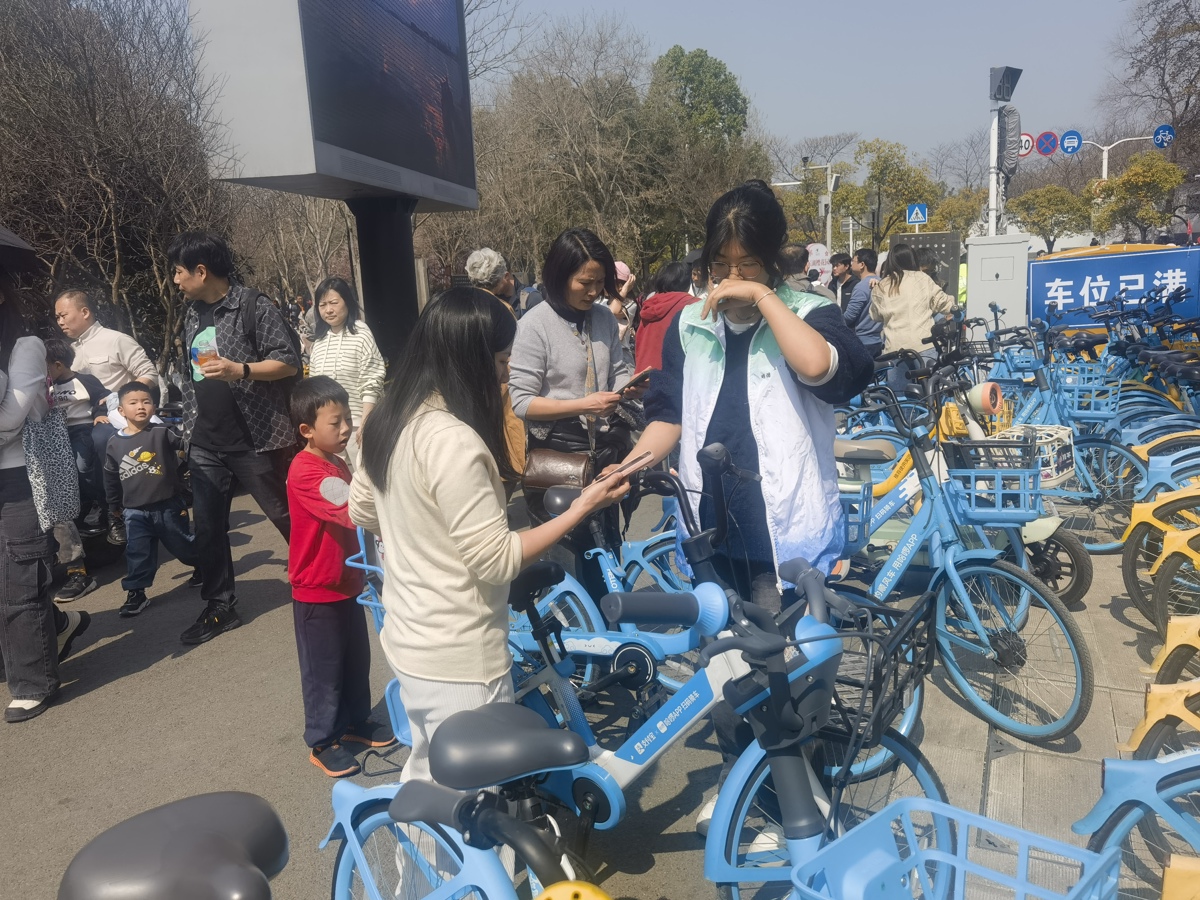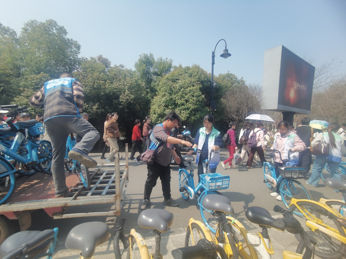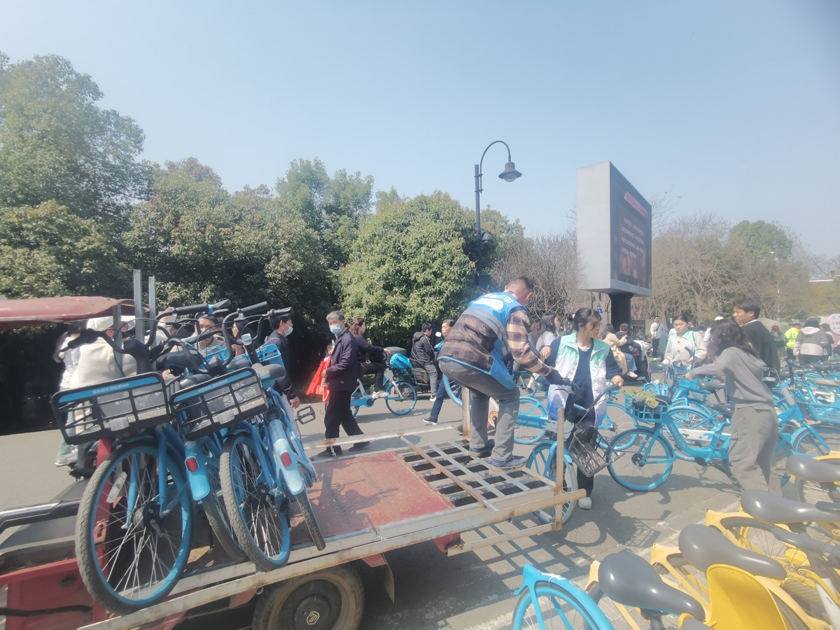 3月14日,东湖磨山樱花园迎来客流高峰,在樱花园周边,来自中国地质大学的8名大学生与哈啰出行运维人员一道,清理共享单车,保障通行秩序。