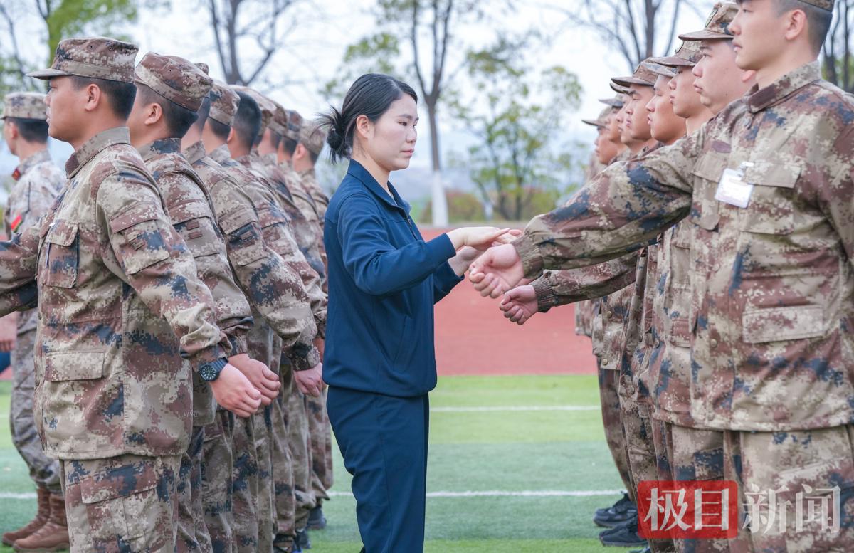 “能展示一下踢正步吗?”人群中一声请求,引来众人附和。翟玉环谦逊一笑,捋顺头发后迈步展示。标准的摆臂、精准的步幅,每一个动作都透着干练与飒爽,落地时的铿锵声响回荡在训练场。一曲正步展示完毕,雷鸣般的掌声立刻席卷全场,新兵们的眼神中满是敬佩与向往。