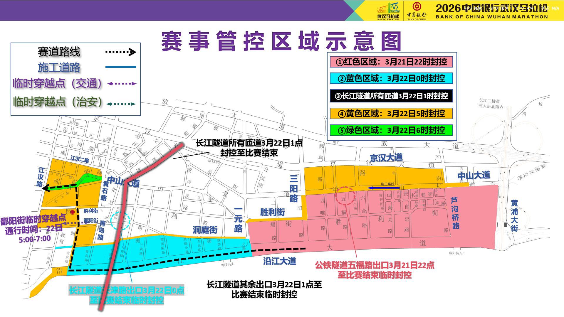 禁止车辆通行:沿江大道(含)—黄浦大街(不含)—中山大道(不含)—三阳路(不含)—胜利街(不含)—一元路(不含)合围区域;长江公铁隧道五福路出口临时封闭。