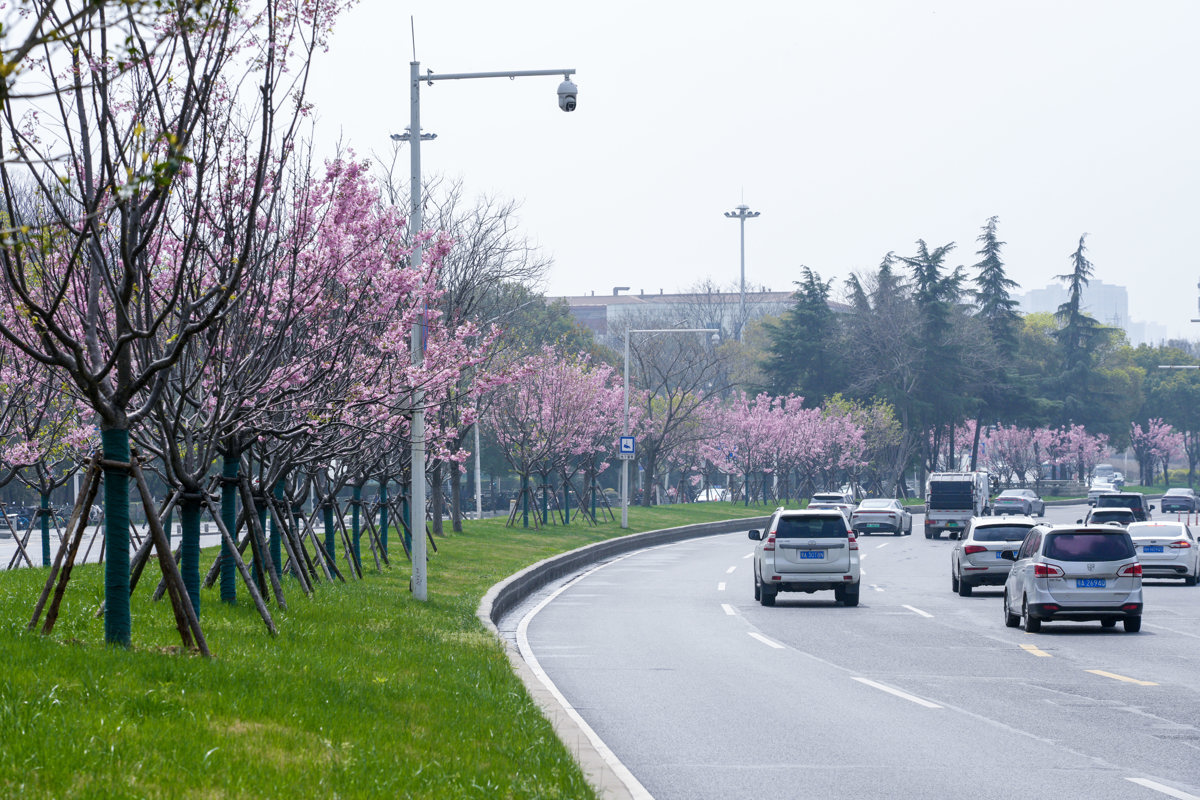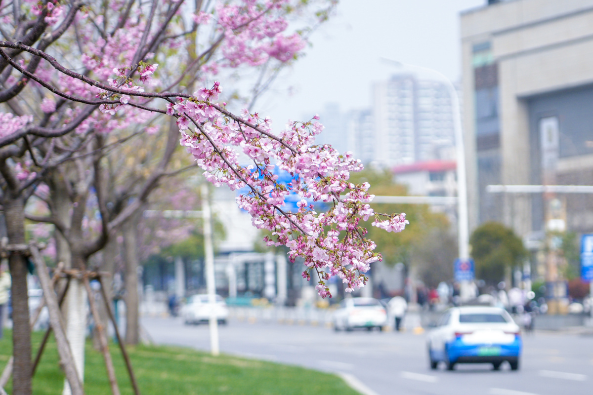 其中,中山路武昌火车站段中央大花坛应用“樱花”作为特色组团,以“阳光樱组团+常绿组团”为整体布局节奏,科学搭配植物品种,精心规划景观层次。据悉,该区域新栽植阳光樱、染井吉野樱共71株,阳光樱作为中樱代表,粉艳的花瓣先叶绽放,满树繁花如粉色云霞,极具观赏性。