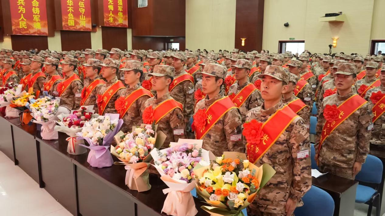 大会现场座无虚席,全体入伍新兵身着荒漠迷彩服、身披“光荣入伍”绶带、胸戴大红花,身姿挺拔、精神抖擞,眉宇间满是青春的朝气与投身国防的坚定,尽显新时代汉阳青年的昂扬风貌。