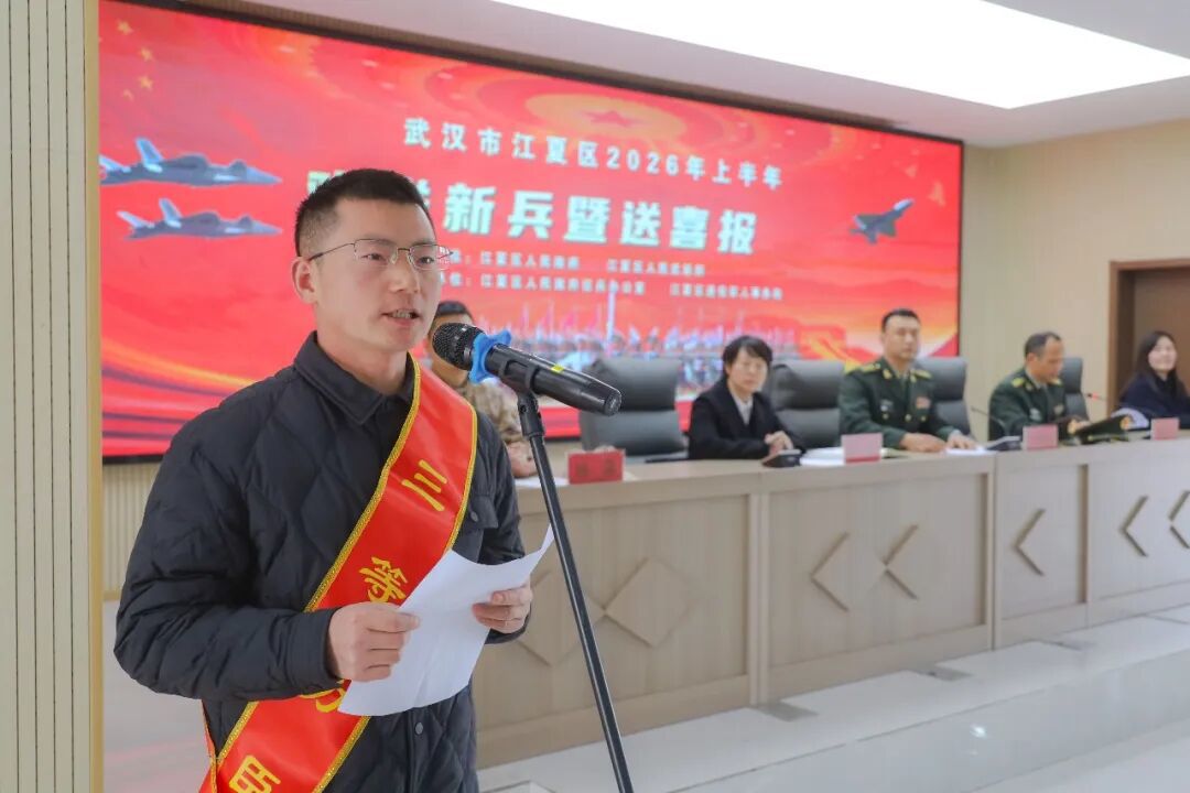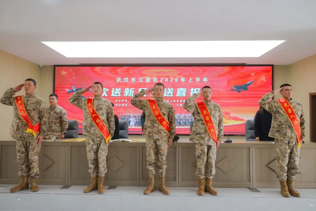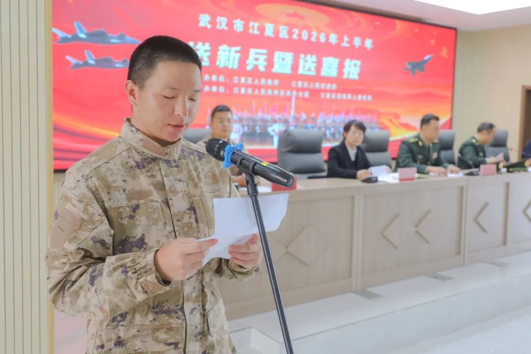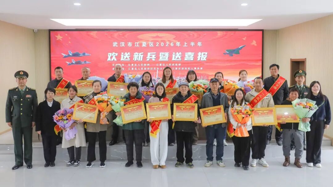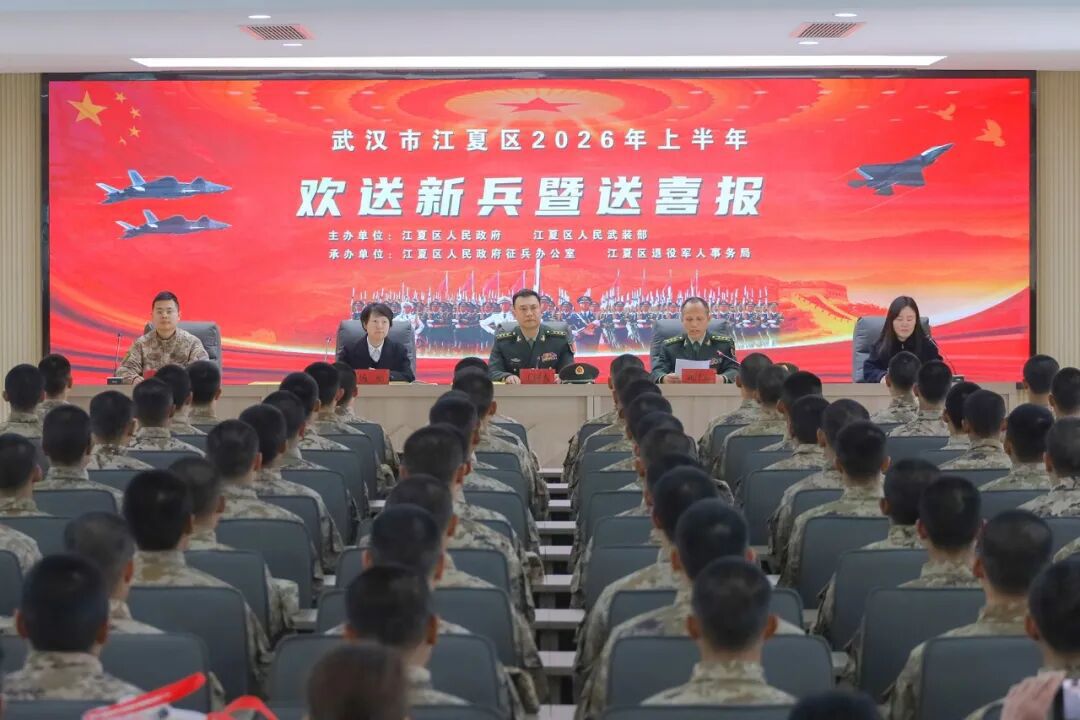春潮涌动启新程,戎装逐梦赴荣光。3月19日,武汉市江夏区举行2026年上半年新兵入伍欢送暨立功受奖军人家属表彰活动。170名身着崭新迷彩服的预定新兵精神抖擞、整装待发,12名立功受奖军人家属身披荣光,共同见证这一庄严时刻。