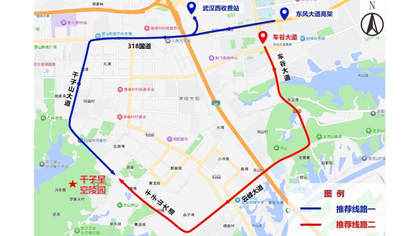 推荐线路一:中心城区-东风大道高架(或武汉西收费站)-318国道-千子山大道-千子星空陵园