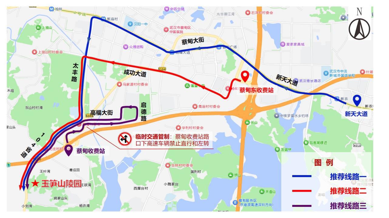 推荐线路三:中心城区-汉蔡高速蔡甸收费站-高福大街-启德路-苏李路-高福大街-104省道-玉笋山陵园