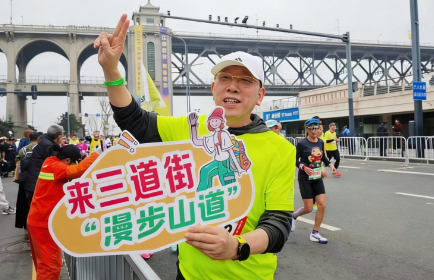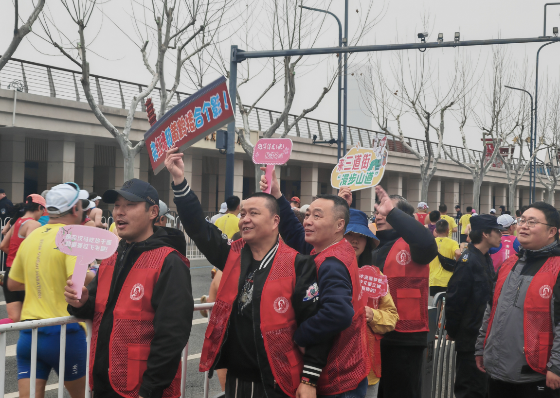 赛道两侧,志愿者们结合街道特色,手持“汉味美食第一巷”“来三道街漫步山道”等定制手举牌,与彩旗交相辉映,大家齐声高喊加油口号,激昂的欢呼声此起彼伏,成为激励跑者奋勇前行的暖心力量,用最热烈的方式为每一位跑者鼓劲喝彩。