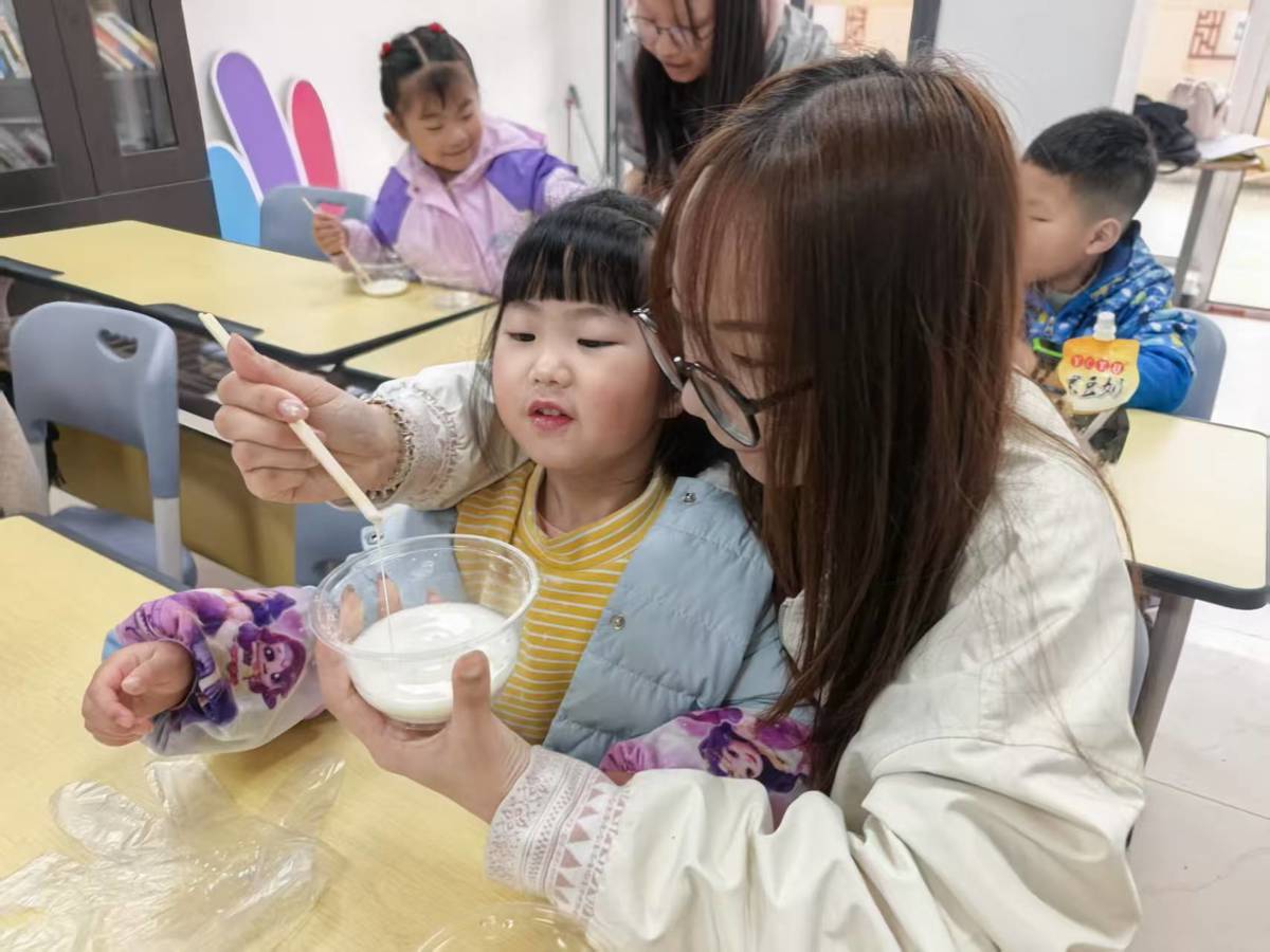 活动过程中,生化学院的志愿者们化身“科学魔法师”,用生动的比喻揭开非牛顿流体的神秘面纱:“它就像个‘小调皮’,你轻轻摸它,它软乎乎像液体;你用力捶它,它却硬邦邦像石头!”在志愿者的一步步指导下,孩子们按照比例将淀粉与清水混合,加入自己喜欢的彩色色素,小手不停搅拌,原本普通的食材渐渐变成了半透明的神奇流