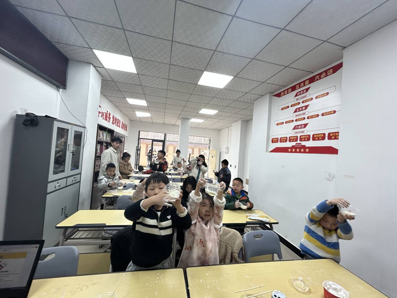活动开始前,社区工作人员与生化学院志愿者早早布置好“魔法实验室”,将玉米淀粉、清水、塑料碗等材料整齐摆放,提前排查安全隐患,为孩子们打造了一个安全又充满探索欲的实验空间。孩子们带着好奇与期待有序签到入场,生化学院的志愿者们用活泼的语气强调实验小规则,叮嘱大家“轻拿轻放、大胆尝试、互相帮忙”,瞬间拉近了与孩子们的距离,让现场氛围轻松又热烈。