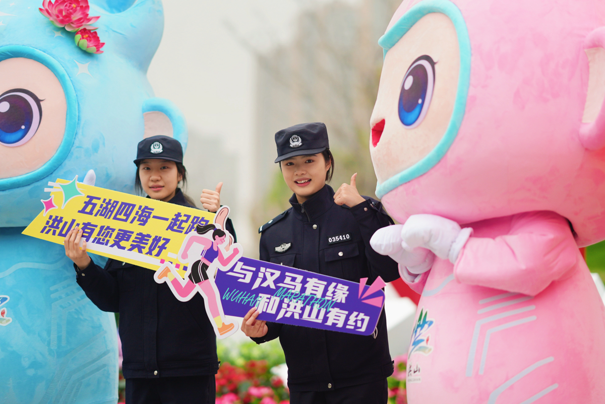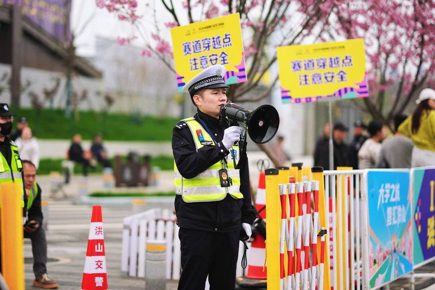 随着发令枪响的消息从起点传来,对讲机里此起彼伏的指令声让气氛骤然热烈。9时20分许,当第一梯队的选手即将进入洪山辖区时,现场执勤民警背对赛道、面向观众,筑起了一道藏蓝防线。