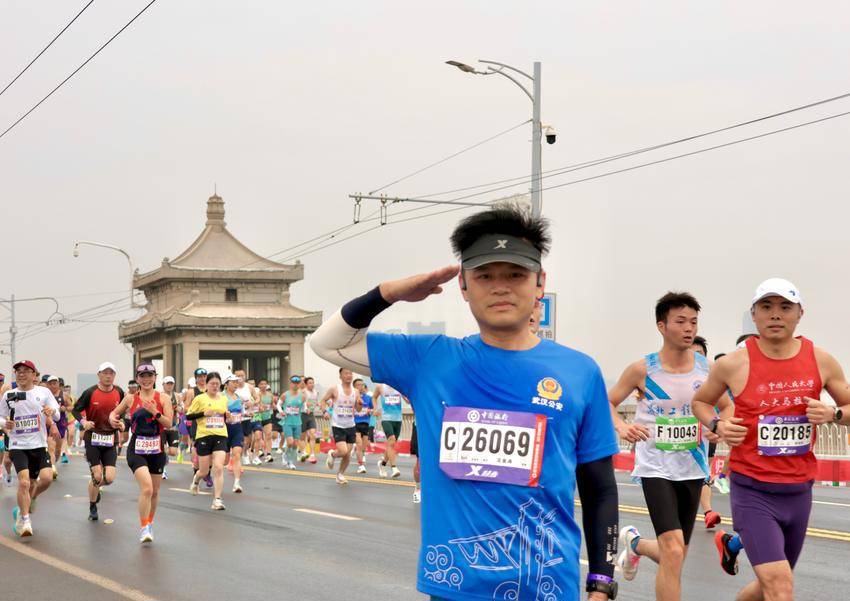 上午9点,奔跑的队伍行进至长江大桥上桥闸道。连续的爬坡路段让队伍整体速度放缓。“加油、跟上步伐,过了坡就好跑了!”“汉马护跑团”成员王金涛一边领跑带动节奏,一边高声为身边选手加油。声声呐喊点燃了跑者的斗志,队伍重整状态稳步爬坡。不少选手冲过坡顶后,主动向沿途执勤警力挥手致意,在长江大桥、黄鹤楼下合影留念,定格热血瞬间。