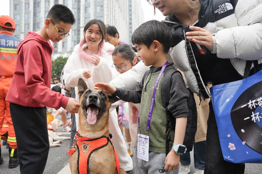 在搜救犬互动区,拉布拉多“安妮”、马犬“迪迦”和史宾格“可可”化身“明星接待员”,轮番与游客近距离互动。从安静蹲坐配合合影,到温顺地接受抚摸,再到俏皮地衔来玩具邀请人们玩耍,三只小家伙各展魅力,引得大家纷纷举起手机。短短半小时,互动区前便排起长队,成为展区最热门的打卡点。