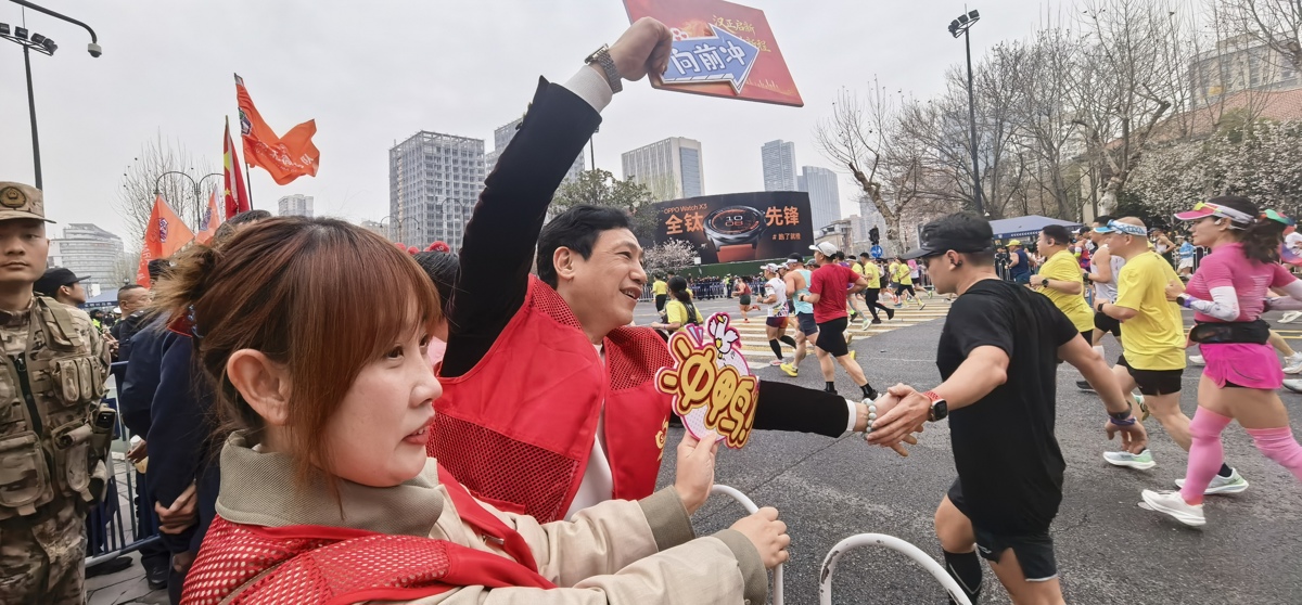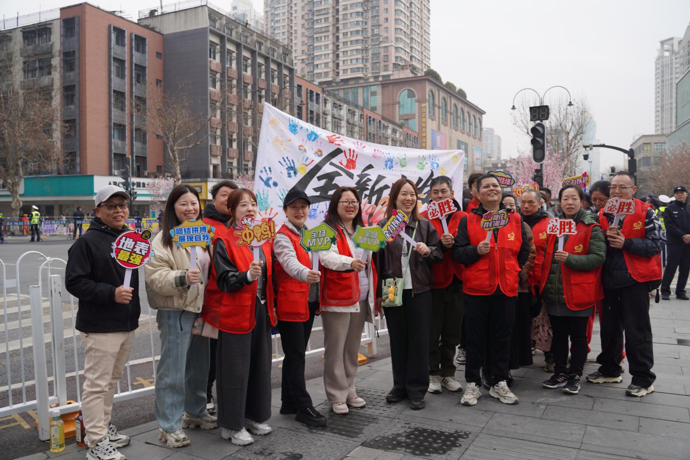 在中山大道、江汉桥下,由街道干部、社区工作者、热心商户组成的“汉正街志愿服务队”,以最饱满的热情喊出“汉正街欢迎你”的口号。他们不仅是秩序的维护者,更是城市温度的传递者。补给站前,递水送药、微笑鼓劲;路口节点,耐心引导、细心提醒。一抹抹跃动的志愿红,成为赛道旁最温暖的底色,让跑者在全力冲刺之余,也能感受到来自汉正街的贴心守护。