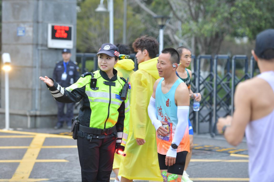 清晨,一辆辆存衣车有序停放在指定路段,并在起跑仪式前十五分钟准时通过中山大道转场。来自四唯所、西马所、劳动所、台北所、永清所等所的数百名警力,不仅肩负着各个路口水马的控制守护,更承担着引导数万名参赛选手有序流动的重任。“A组的参赛选手们请往左走,B组参赛选手请往右走!”“存衣车在前面,请往前走。”在胜利街、中山大道的各个路口,执勤民警与赛事志愿者密切配合,用清晰的手势和温暖的指引,帮助运动员快速找到入口。在周边路段,执勤民警还特别留意存衣车周边的安全,防止财物丢失和人员聚集拥挤,确保选手们能够安心、从容地做好赛前准备。