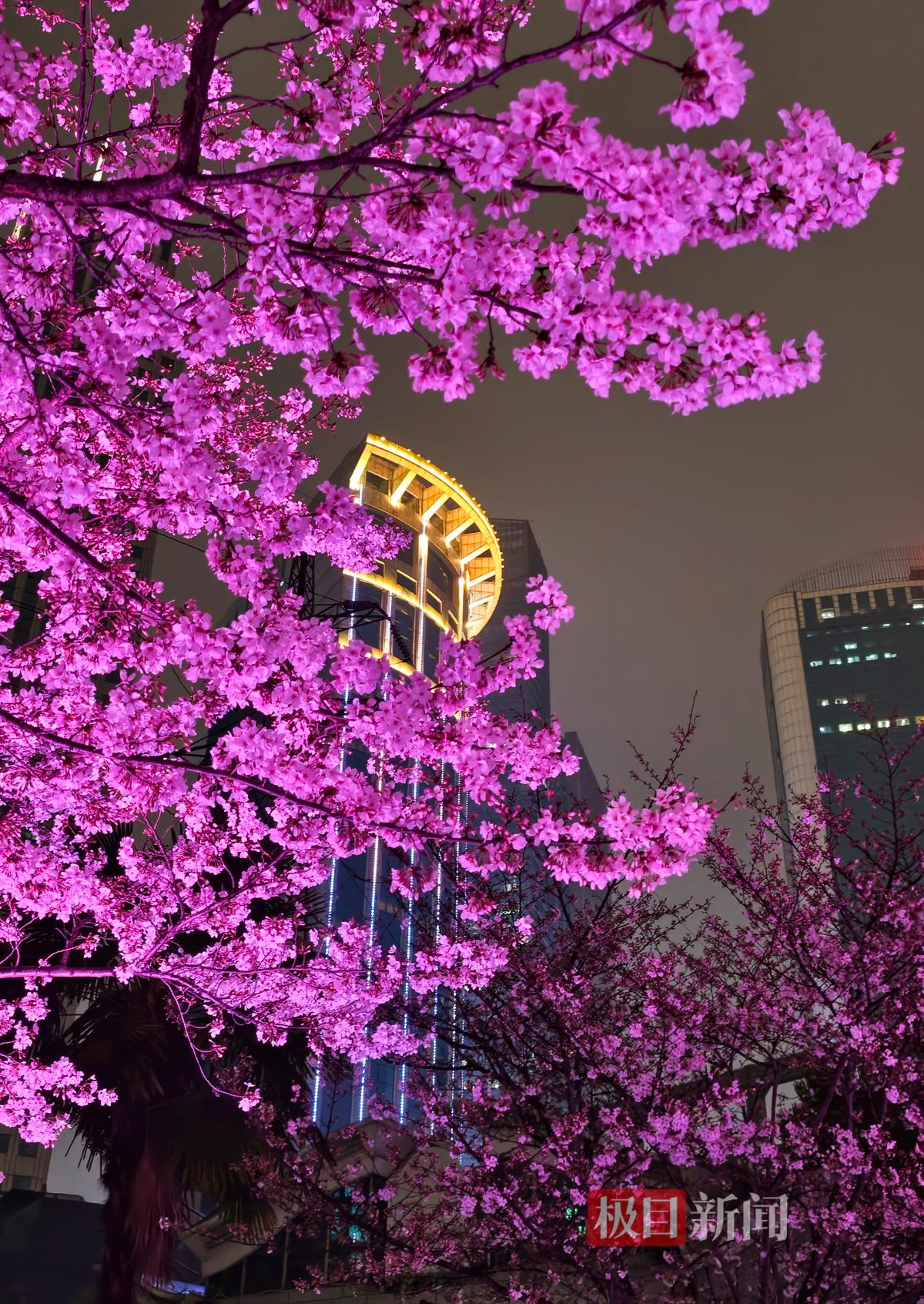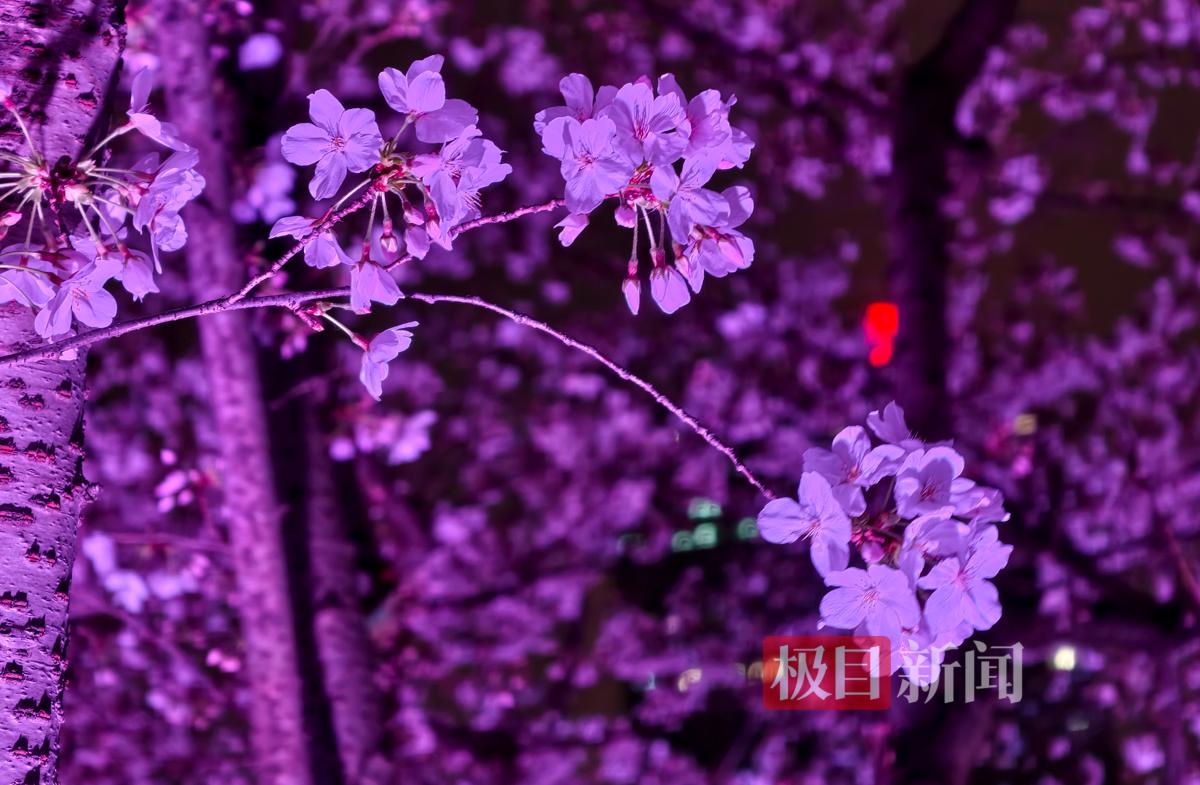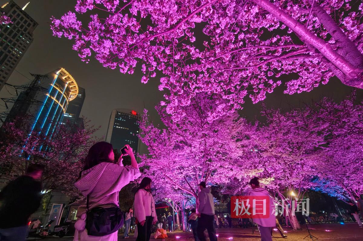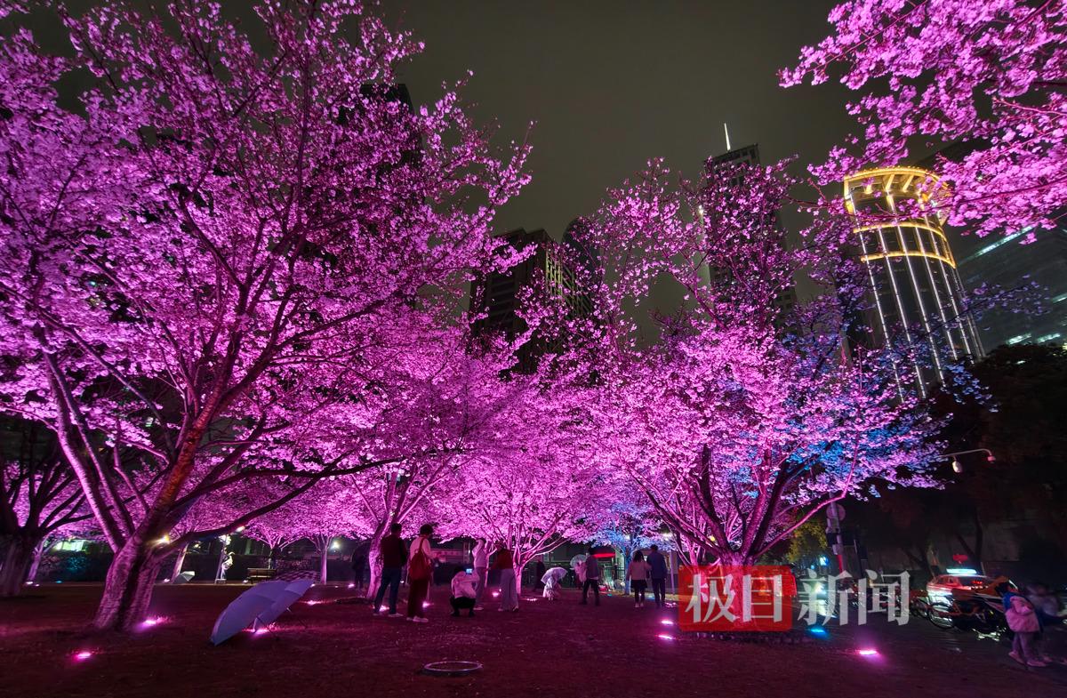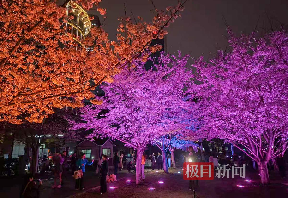 3月23日晚,极目新闻记者现场看到,园内的樱花大道流光溢彩,变换的景观灯将一株株花枝繁茂的樱花树点亮,花瓣在变换的光影中显得分外妖娆,众多游客在花林间流连忘返,用镜头定格下梦幻般的夜樱与周边高楼幕墙流光相融的画面。