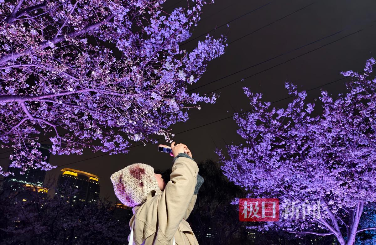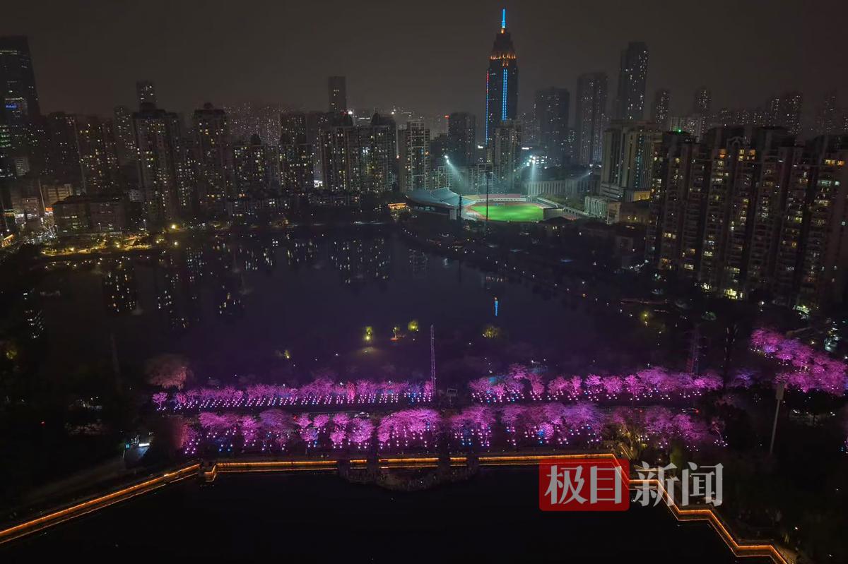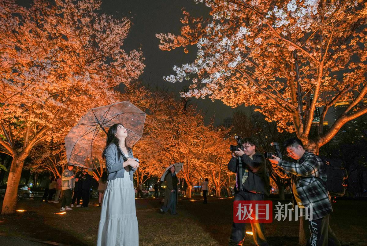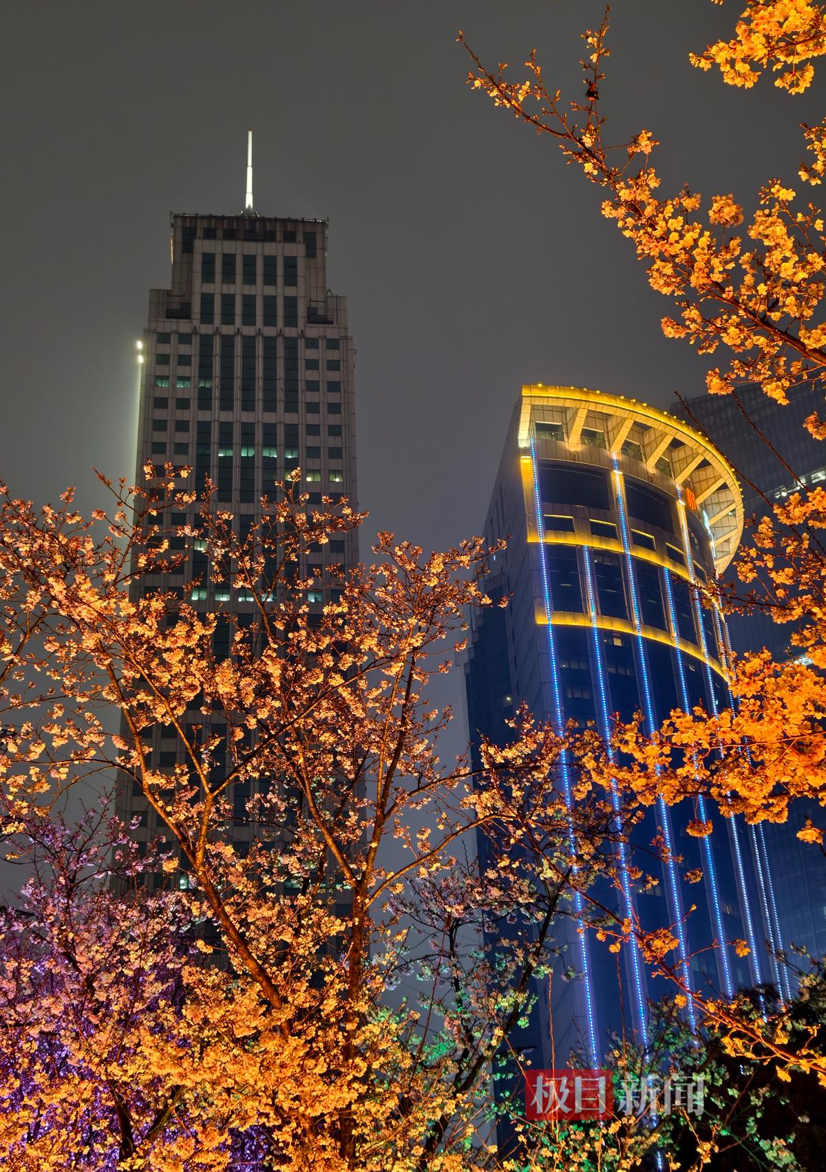 3月23日晚,极目新闻记者现场看到,园内的樱花大道流光溢彩,变换的景观灯将一株株花枝繁茂的樱花树点亮,花瓣在变换的光影中显得分外妖娆,众多游客在花林间流连忘返,用镜头定格下梦幻般的夜樱与周边高楼幕墙流光相融的画面。