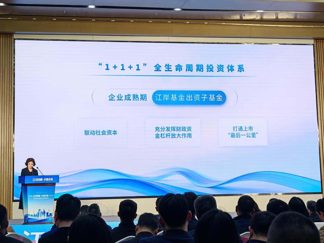 主题推介环节中,江岸多部门协同发力,打出绿色发展“组合拳”。区发改局解读专项扶持政策,聚焦水利、水电等四大领域,覆盖数字水利等八个细分赛道,推出最高1000万元的科研平台奖励等举措。区政府办(金融)推介绿色金融与科技金融成果,2025年为700余家科技企业授信超72亿元,构建起覆盖企业全生命周期的金融服务体系。江岸产投集团推出“1+1+1”全生命周期投资体系和七大高品质产业载体,从资本与空间两方面为企业提供全链条支撑。
