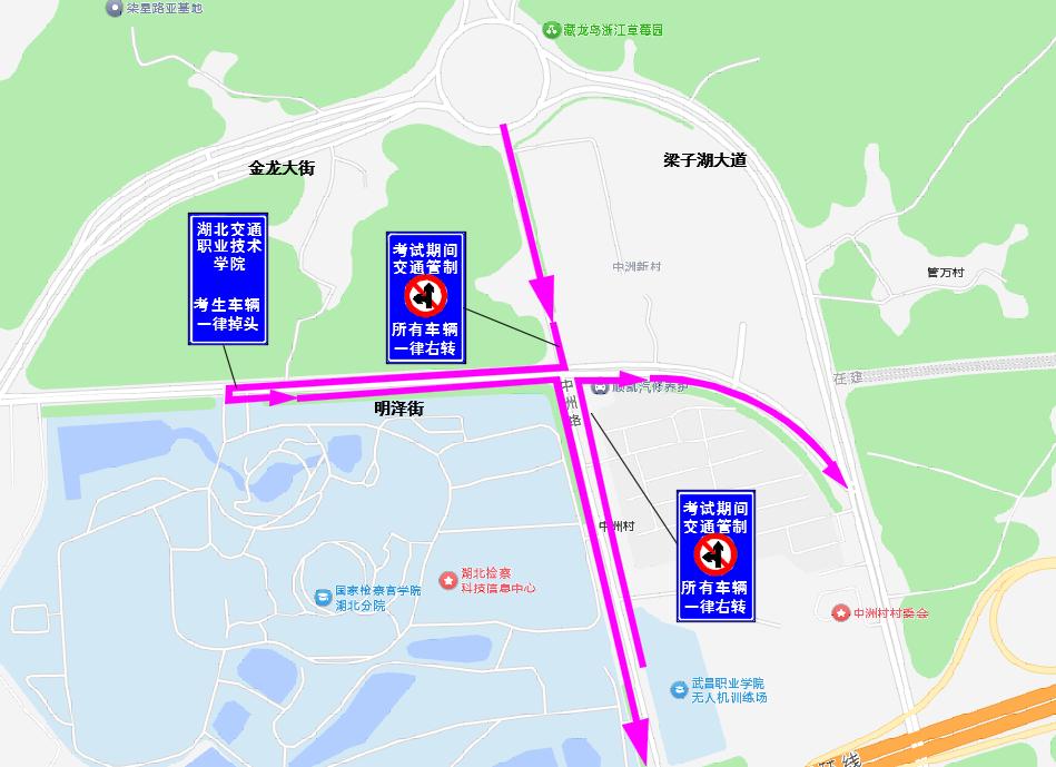 中洲路明泽街路口交通管制:北向南车辆一律右转,南向北车辆一律右转。参考考生车辆从明泽街国家检察官学院门口掉头,在明泽街中洲路路口右转。