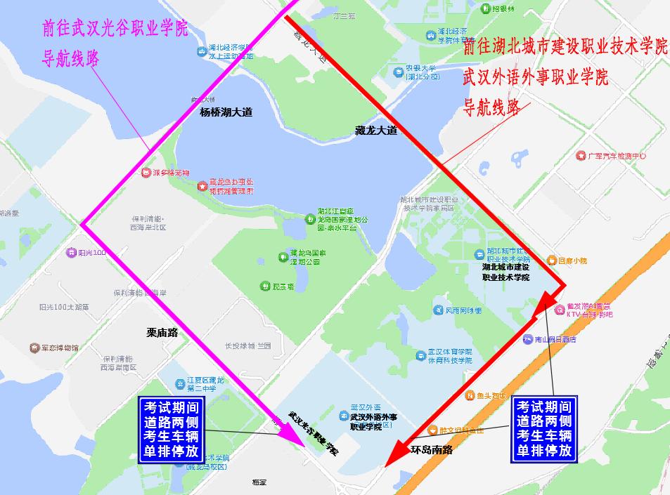 湖北城市建设职业技术学院:光谷方向考生车辆行驶至藏龙大道→环岛南路学校东南门进入,在环岛南路道路两侧单排停放车辆。