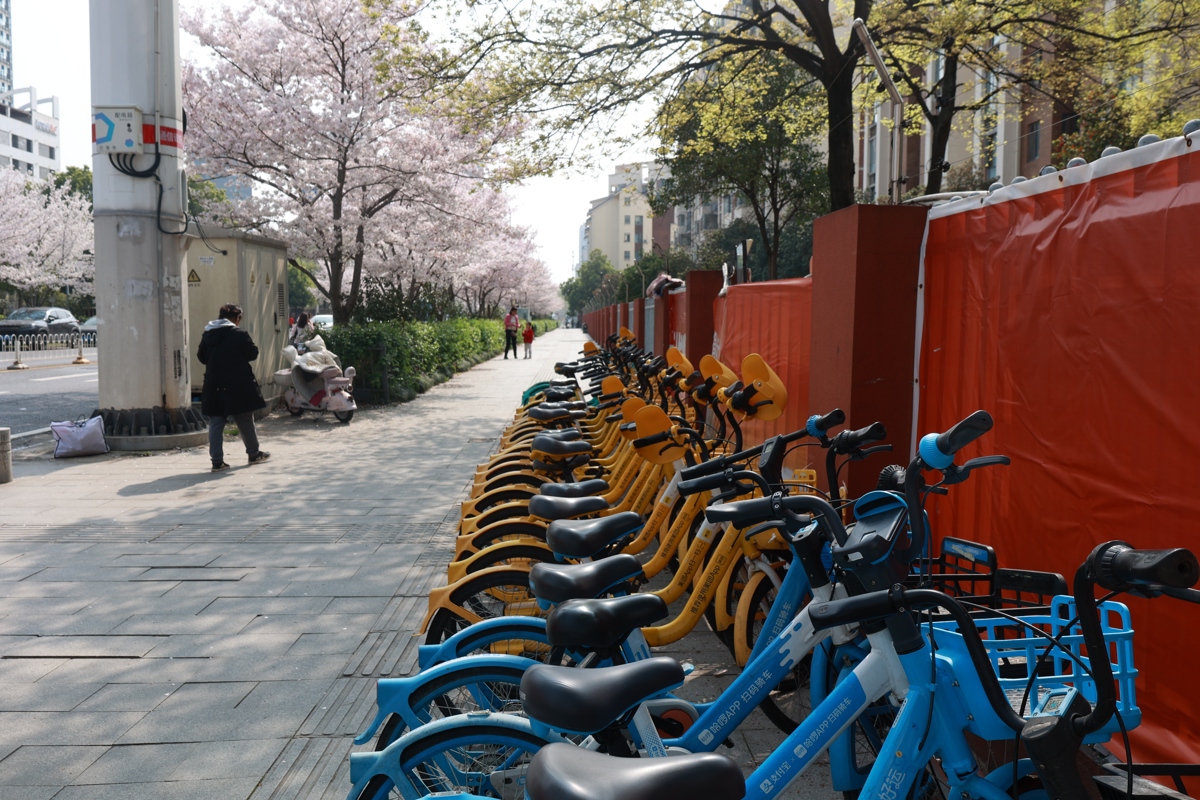 此次行动聚焦文治街、佰港城周边、珞狮路沿线、街道口等樱花打卡热点与人流密集路段。随着近期市民游客骑行赏花增多,部分共享单车出现随意停放、倒伏和占道等情况,既影响通行安全,也影响市容环境。活动中,来自湖北商贸学院的10名大学生志愿者与城管执法队员分工协作、并肩行动,对道路两侧、樱花树下的共享单车进行全面清理规整。