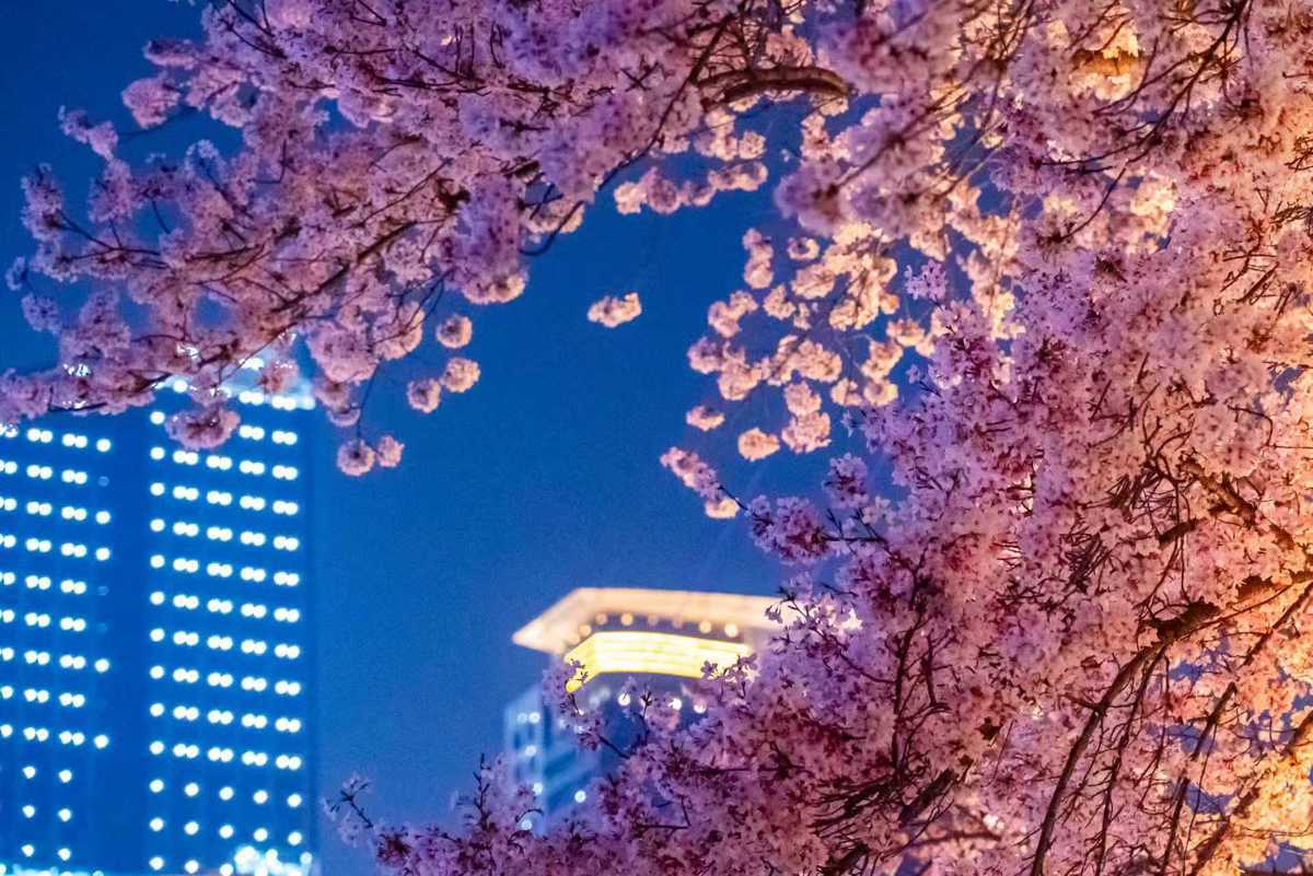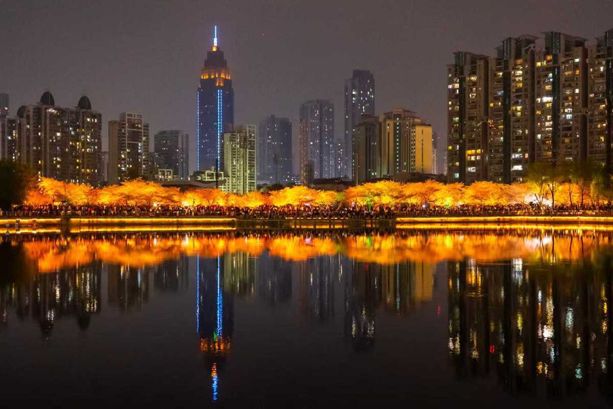 从黄孝西路向湖边望去,400余株樱花在灯光映衬下如云似霞,与波光粼粼的湖面交相辉映。一位摄影爱好者说:“路中间取景,前后景深都有了,构图一下子丰富了很多,今年拍到的照片是我这几年最好的一组。”