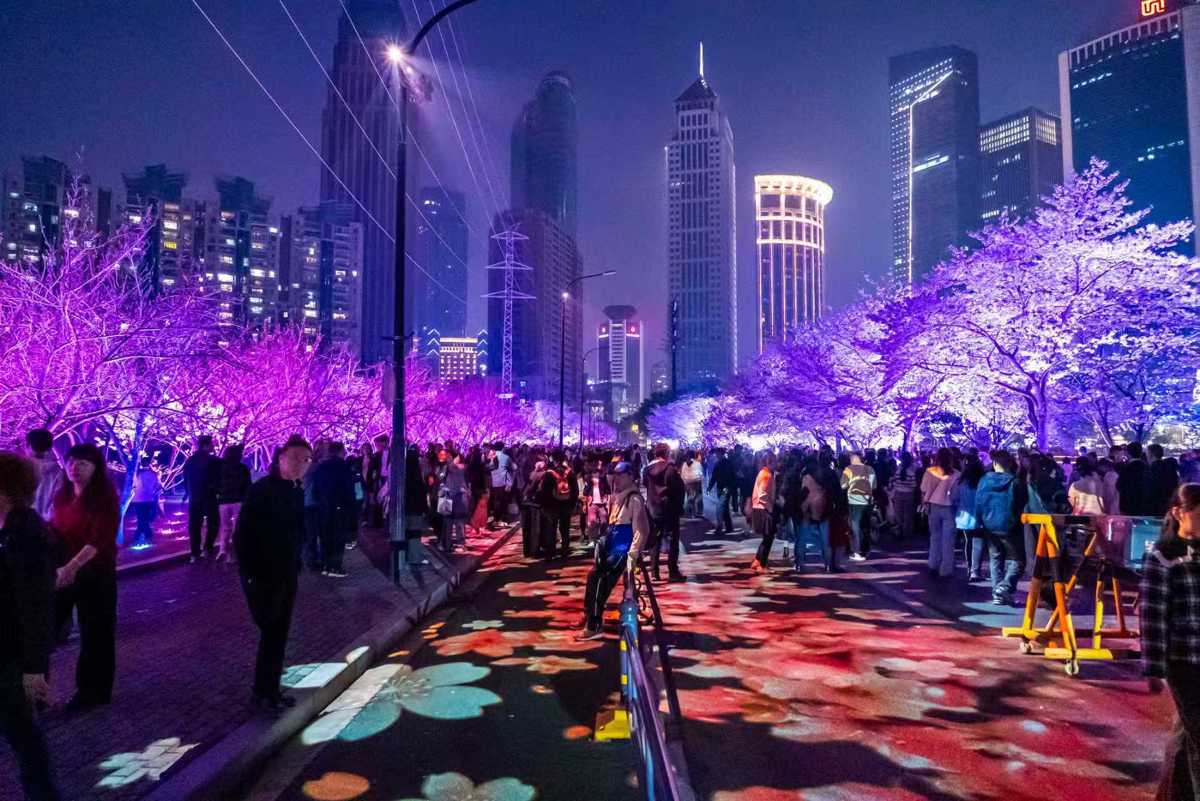 “妈妈快看,花瓣在脚下跳舞!”一个小女孩兴奋地指着地面。主干道上循环播放的樱花主题光影秀来自江汉文旅部门的创意,将飞舞的花瓣、流动的江汉揽胜图投射在路面上,铺就了几十米长的梦幻“地毯”。“以前只能在人行道上挤来挤去,现在能大大方方站在路中间拍照,花海效果太震撼了!”专程来汉赏花的李女士一边调整角度,一边兴奋地向记者展示刚拍的照片。