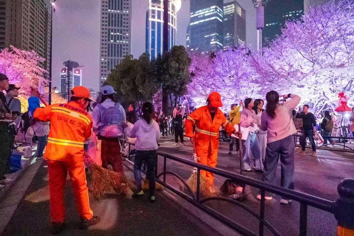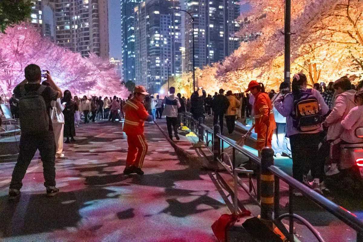 3月27日,武汉市江汉区西北湖绿化广场400余株樱花迎来最佳观赏期,夜色中花影摇曳,赏樱市民络绎不绝。为提升游客体验,黄孝西路西北湖绿化广场赏樱点实施了临时交通管制,在客流高峰时段将该路段改为“步行街”,让游客得以走上主路赏樱打卡。这一举措受到市民游客广泛好评。