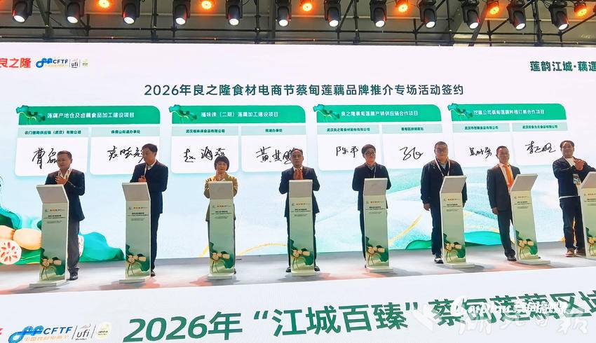 3月28日,“莲韵江城·藕遇知音——2026年‘江城百臻’蔡甸莲藕区域公用品牌推介会”在武汉国际博览中心举办。作为良之隆·2026第十四届中国食材电商节的专场活动之一,本次推介会现场8个项目集中签约,总金额超5亿元,为蔡甸创建国家农业现代化示范区、加快推进农业现代化发展注入强劲动能。