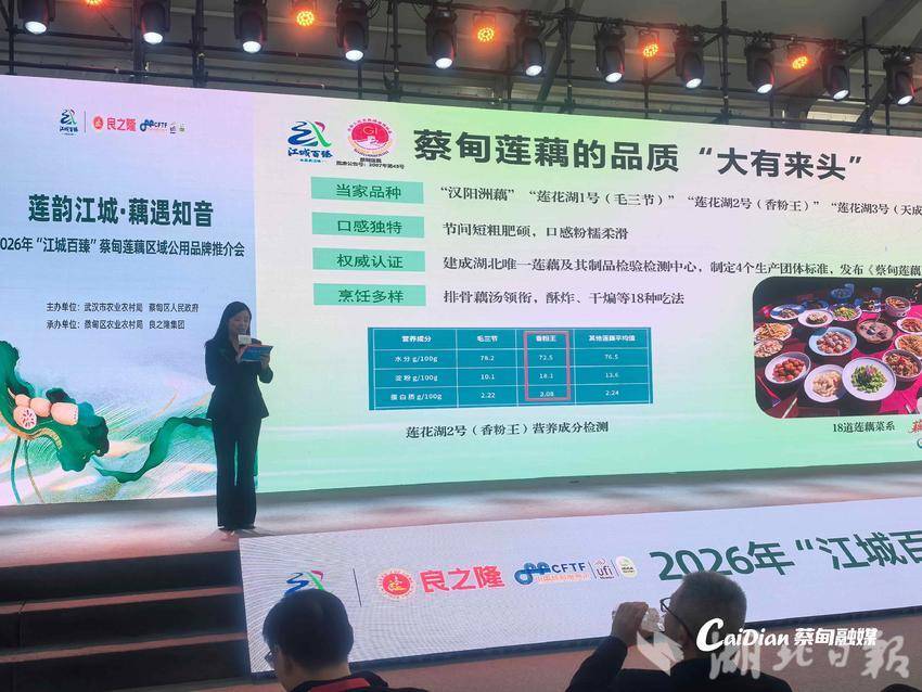 活动在开场舞《我在蔡甸等你》中拉开帷幕,现场播放的品牌宣传片、蔡甸楚剧团原创音乐情景剧《哪吒寻根记》等环节精彩纷呈。“江城百臻”推介官赵兰全方位推介了蔡甸莲藕,湖北省莲藕及其制品质量检验检测中心专家黄红松发布了蔡甸莲藕品质检测分析报告。武汉餐饮业协会会长刘国梁高度认可蔡甸莲藕的口感与市场价值,楚菜大师还现场烹饪、展示蔡甸莲藕宴,一道道特色佳肴,尽显蔡甸莲藕的魅力。