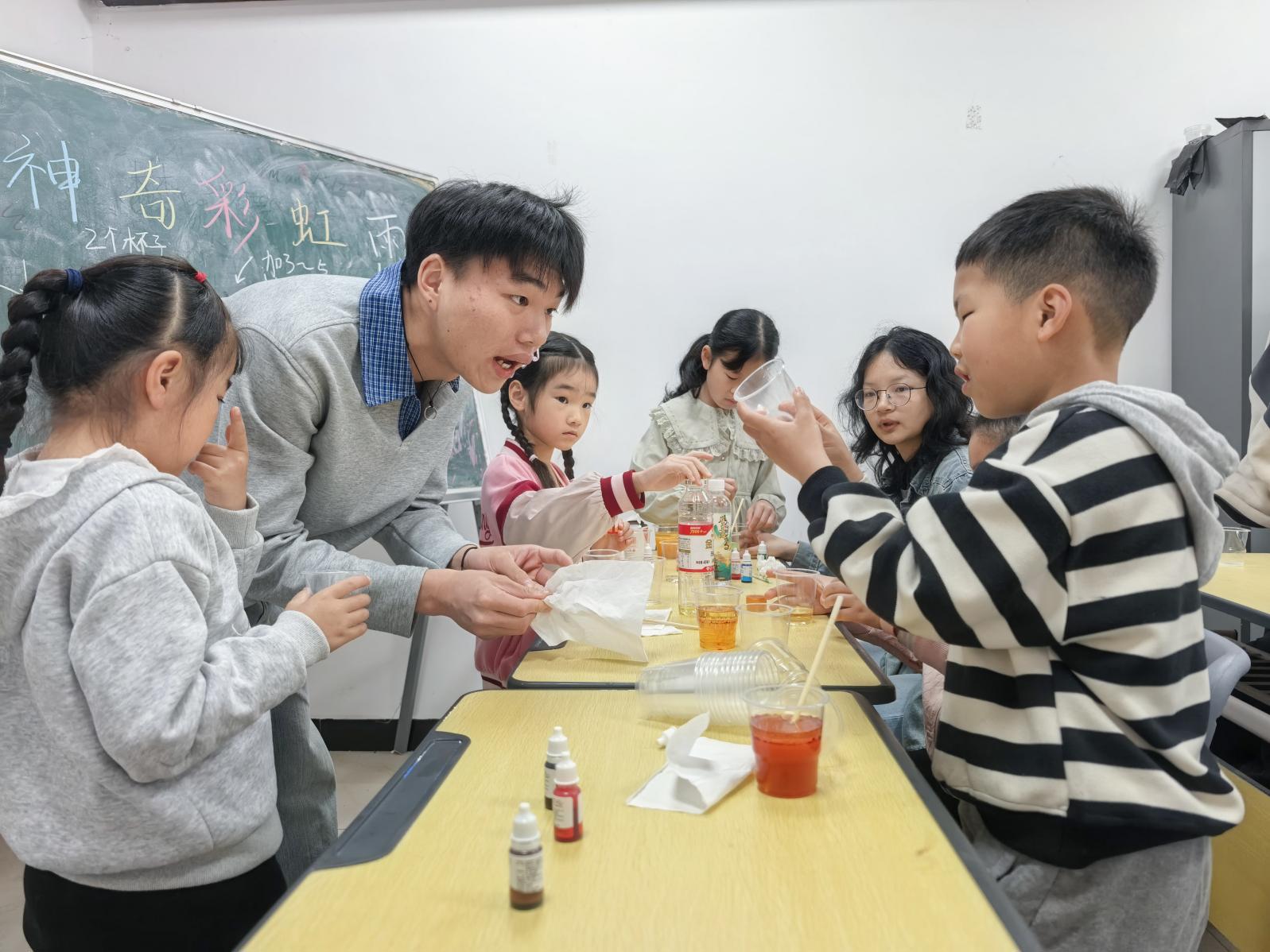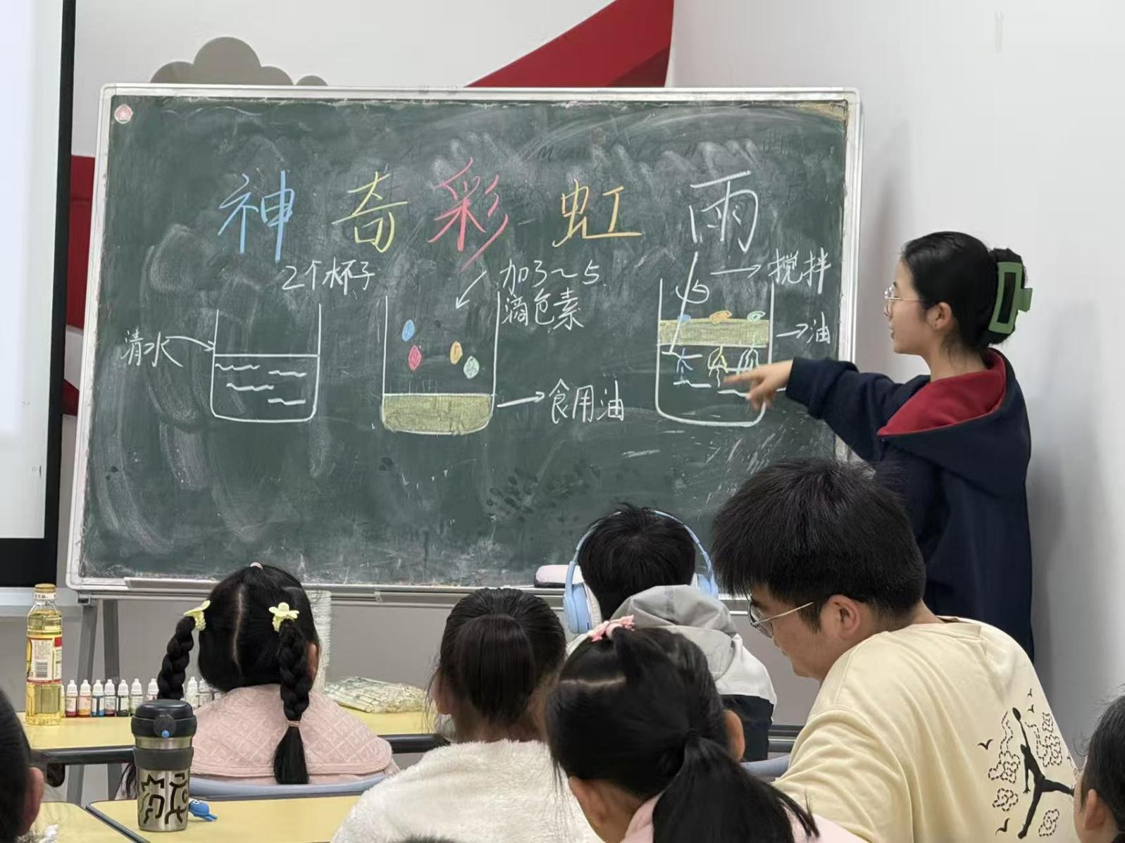 当彩色液滴穿透油层,像雨滴一样缓缓坠入清水,在杯中晕染出斑斓色彩时,孩子们发出阵阵惊喜的欢呼。有的孩子专注地观察着色素的下沉轨迹,有的兴奋地和同伴分享自己的“彩虹雨”,还有的在志愿者帮助下调整操作,让实验效果更加明显。整个课堂充满了欢声笑语,孩子们在动手操作中直观感受了密度差异带来的科学现象,在探索中收获了知识与快乐。
