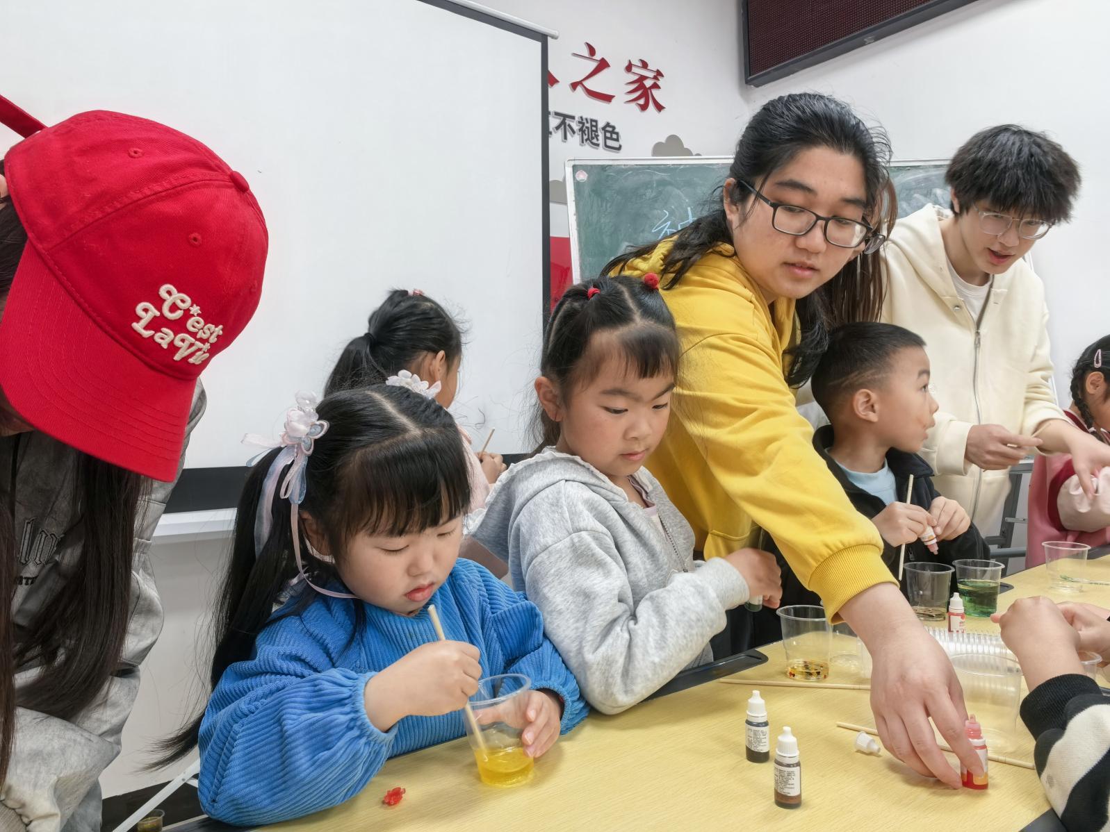 讲解结束后,孩子们迫不及待地开启了实验操作。在志愿者的耐心指导下,大家小心翼翼地往油杯中滴入红、黄、蓝、绿等各色色素,用搅拌棒轻轻搅拌,看着色素在油中形成彩色小液滴;随后将混合液缓缓倒入装有清水的杯子中,静静等待“奇迹”发生。