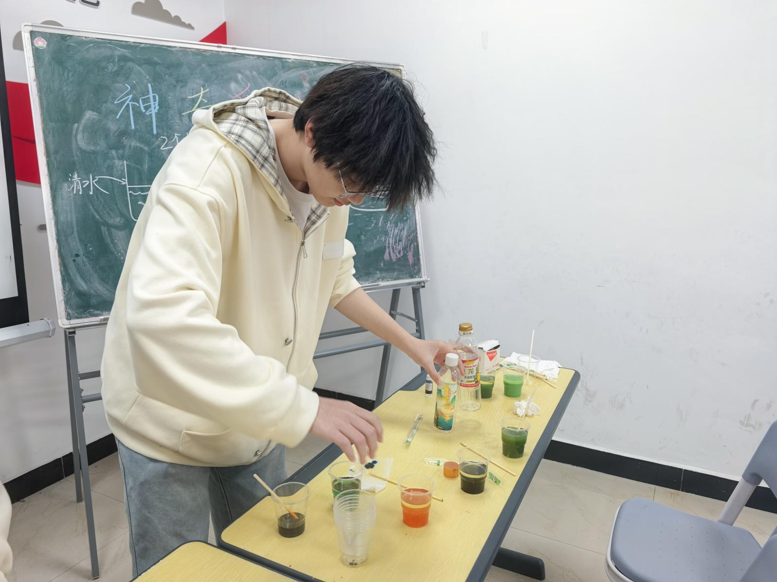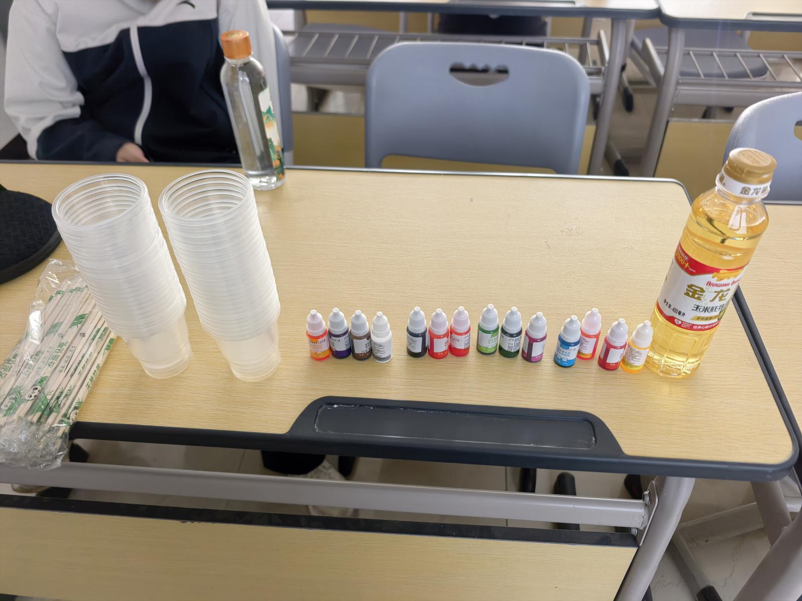 活动开始前,志愿者们提前做好了充分的准备工作,将实验所需材料一一备齐:透明塑料杯、清水、食用油、多色食用色素、搅拌棒等整齐摆放在课桌上,为实验开展筑牢基础。