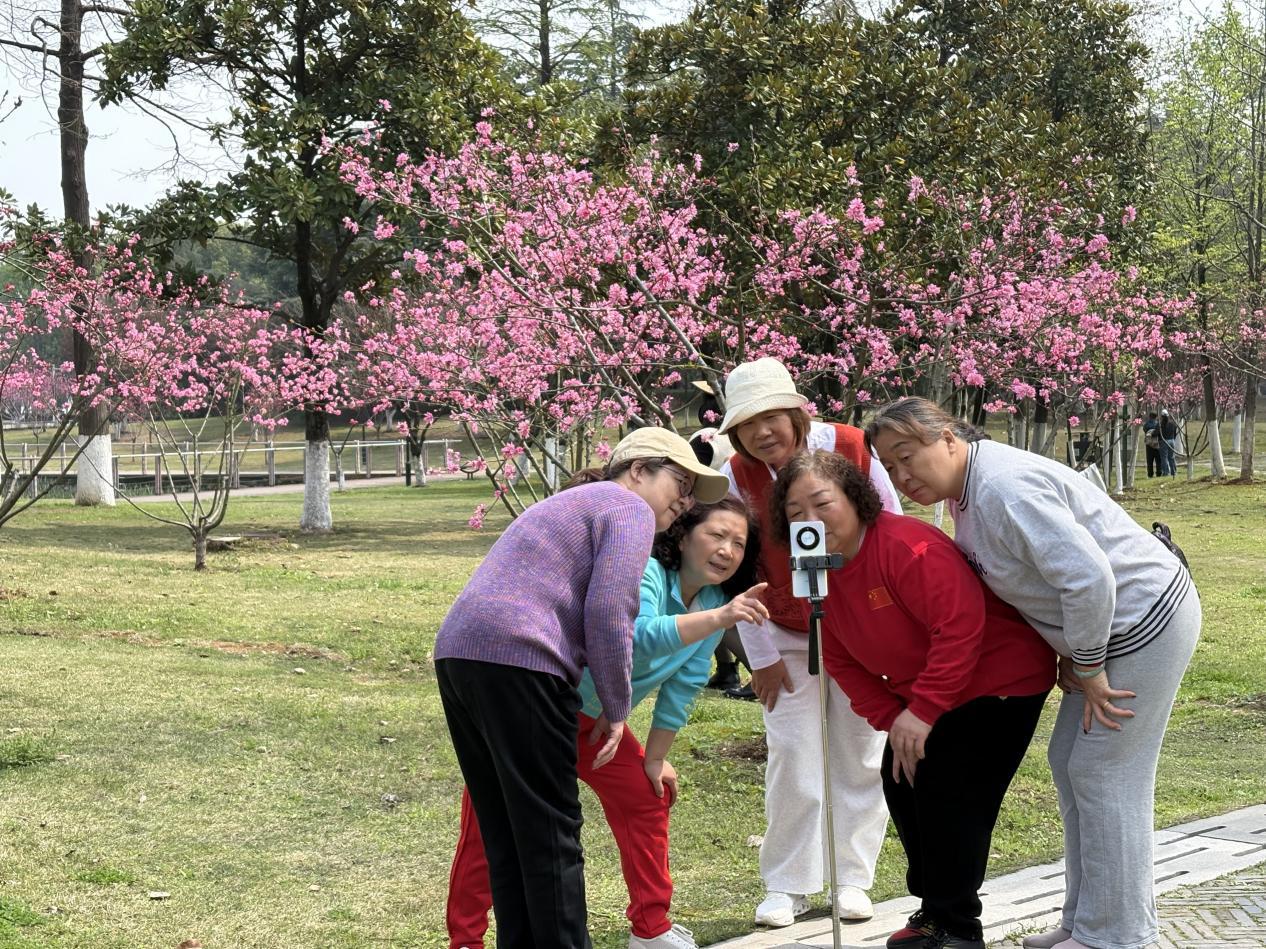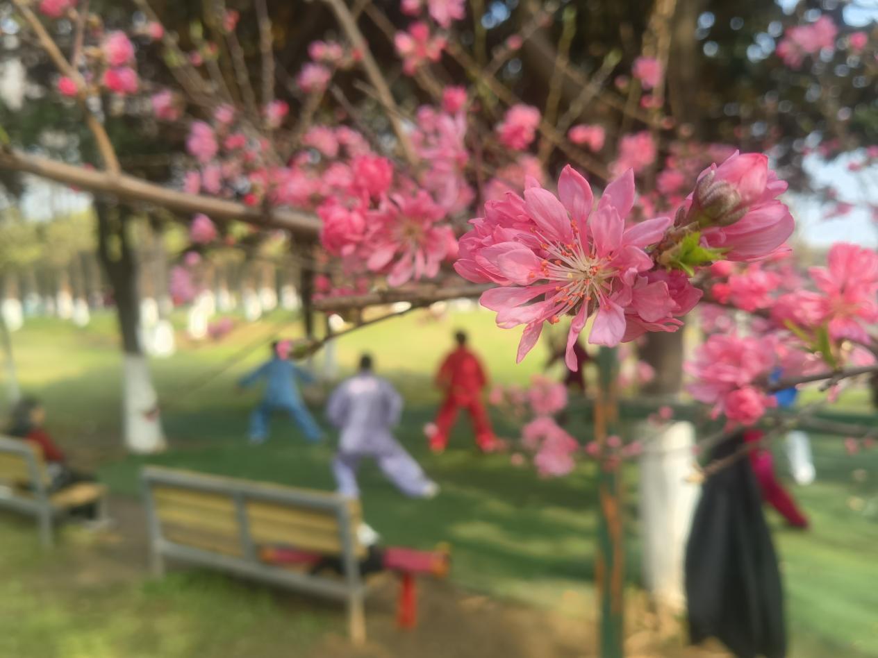 游客在桃花树下拍照、聊天、打太极