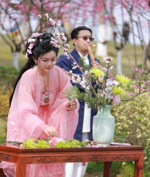 雅集非遗知音花艺代表性传承人柯杏林介绍,今年花朝节(俗称“花神节”“百花生日”“花神生日”,是汉族传统节日八节之一)是3月29日,三月正是桃花夫人息夫人当值,月湖风景区周边又有息夫人传说的核心遗址地——桃花夫人庙与桃花洞,而其园花正是桃花。因此,选择在月湖开展活动很契合主题。