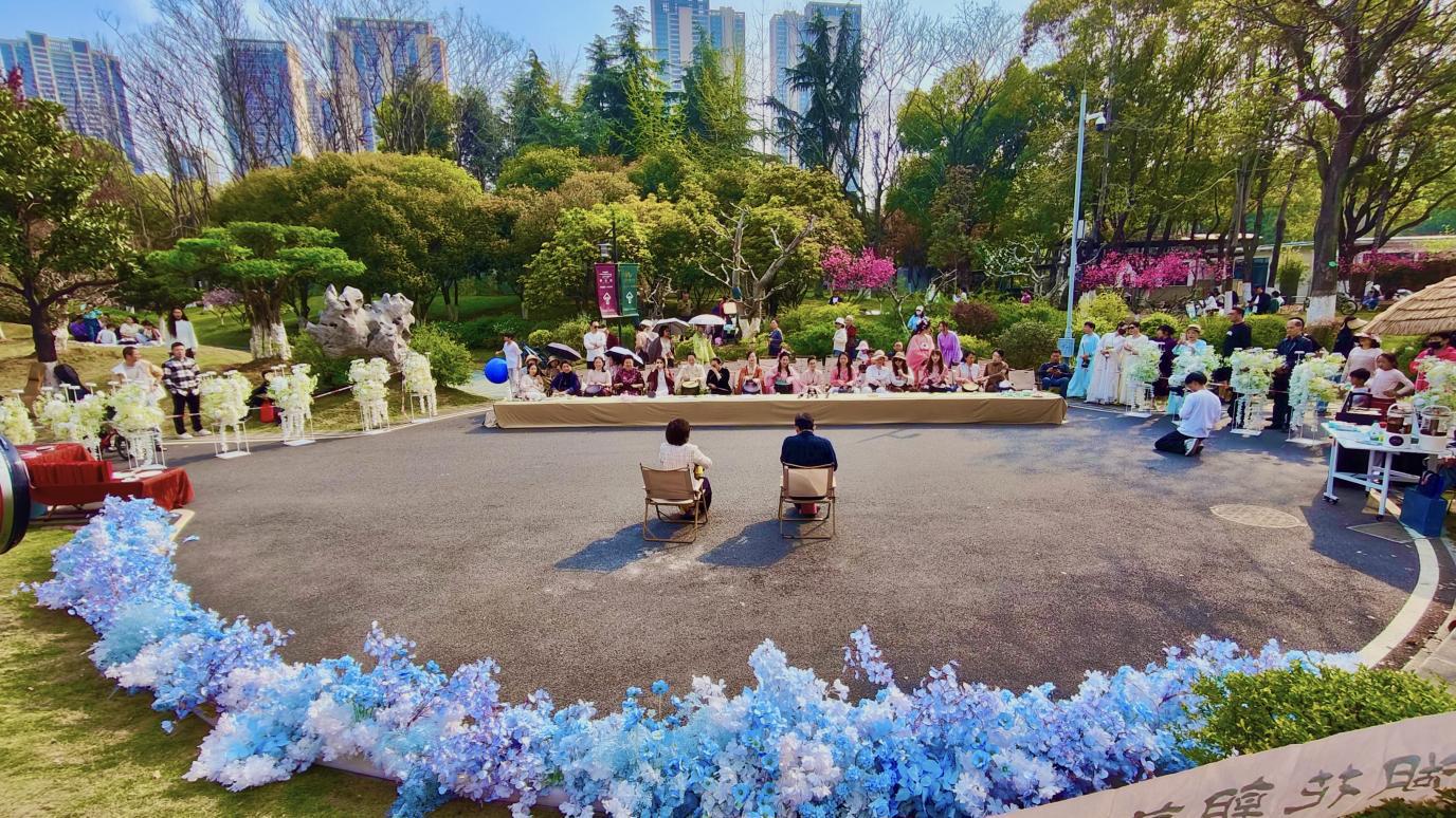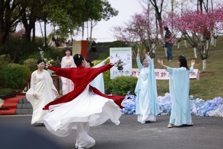 14时30分,月湖风景区花朝节正式启幕,活动在柯杏林插花展示中拉开帷幕,《乌兰巴托的夜》一曲终了,指挥现场嘉宾齐声和唱,歌声穿过花枝,在月湖的水面上飘散。《三生三世十里桃花》将东方意境与心灵疗愈融于每一个舞步。尺八、古琴、手碟、非洲鼓……一个又一个节目在桃花树下轮番上演。书法家张艳红现场挥毫,写下与月湖桃花有关的诗句,多位嘉宾上台诵读桃花诗词。最后,嘉宾们齐声喊出“来到汉阳就是知音”的心声。整场活动将花卉景观、传统民俗、知音文化完美结合,非遗花艺、汉香、禅舞、音疗等文艺节目与桃花林相映成趣,市民游客在花间祈福、品茶、诵诗、听琴,让游客享受一场天人合一的文化盛宴。
