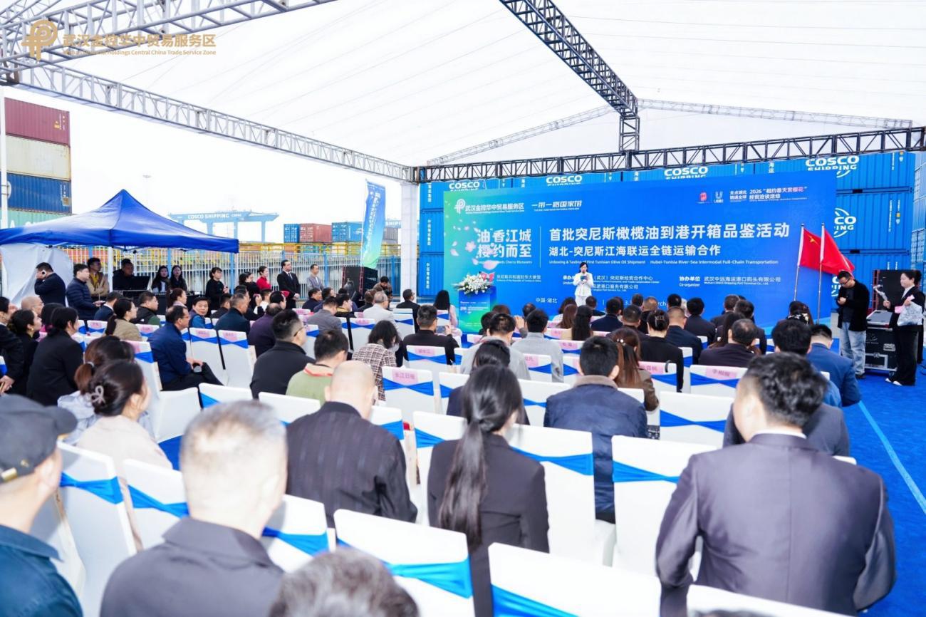 活动由突尼斯共和国驻华大使馆主办,中国(武汉)突尼斯经贸合作中心、武汉阳逻港口服务有限公司承办,武汉中远海运港口码头有限公司协办。突尼斯、土耳其驻华使节、俄罗斯驻武汉总领事,湖北省、武汉市相关部门及企业负责人等嘉宾出席,共同见证突尼斯橄榄油首次以江海联运模式直达阳逻港,标志着鄂突经贸物流合作迈入全链条新阶段。