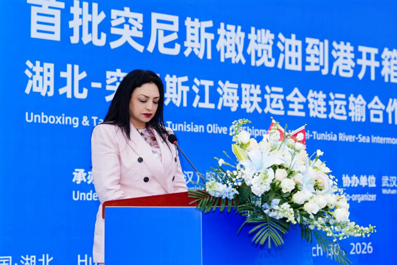 活动中,湖北省商务厅二级巡视员陈斌、突尼斯大使馆公使伊姆-阿雅迪女士、武汉阳逻港口服务有限公司总经理徐宝卫先后致辞,表达了深化中突经贸合作、拓展湖北对外开放新通道的共同愿景。伊姆-阿雅迪公使表示,橄榄油是突尼斯的“液体黄金”,此次首箱抵汉,是连接两国友谊与经贸往来的重要纽带,具有里程碑意义。