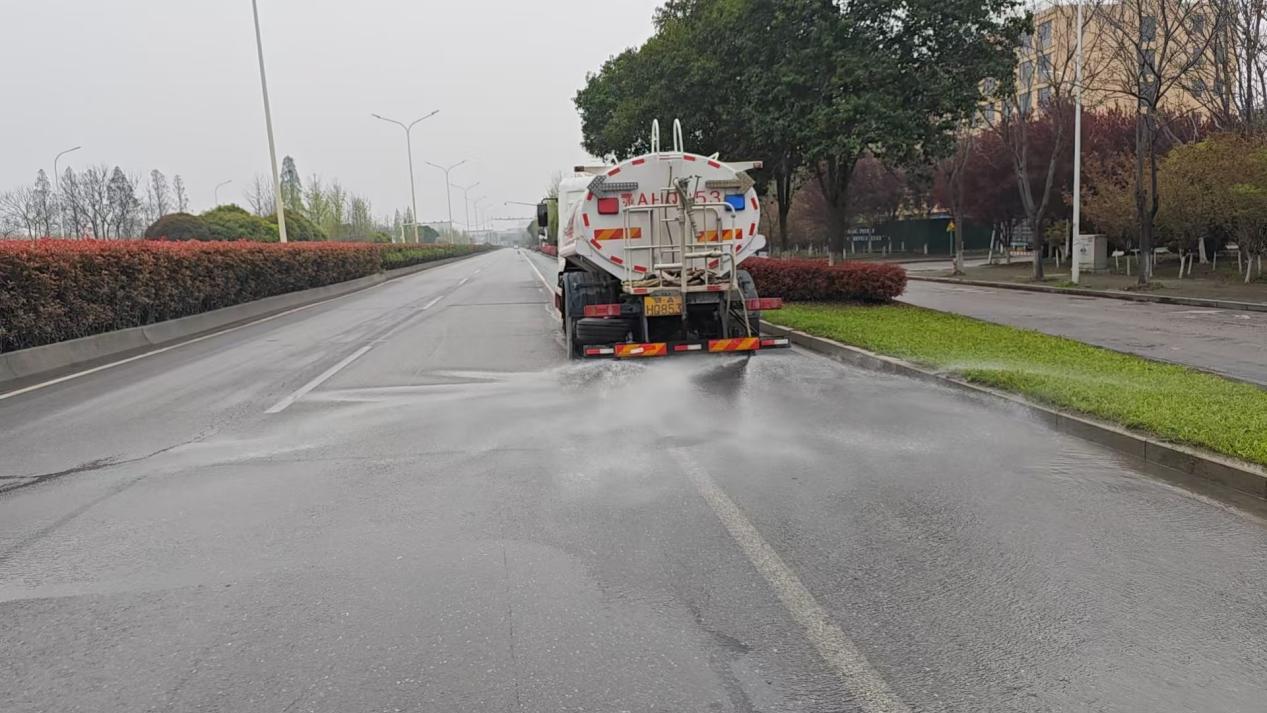 作业现场,机械化保洁梯队高效联动、协同作战。洒水车采用高压水流对路面实施深度冲刷,将积尘、泥沙彻底剥离并汇集至路边;吸扫车紧随其后,对路面进行全覆盖清扫与污水回收。通过“冲、洗、扫”一体化闭环作业,有效清除路面顽固污渍,清晰还原道路本色。