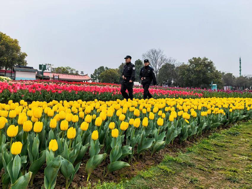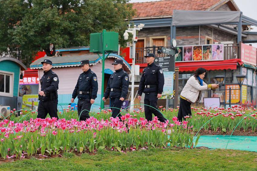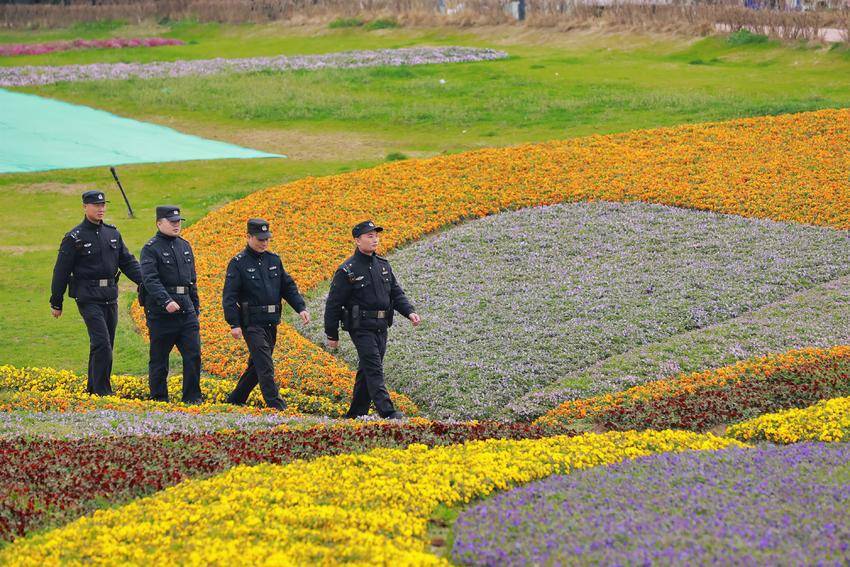 春风拂过花田,花瓣随风轻舞,游客们笑脸盈盈,或驻足赏景,或拍照留念。而那些藏蓝的身影,依旧穿梭在花海与人潮中,巡逻的脚步不曾停歇,守护的目光始终相伴。