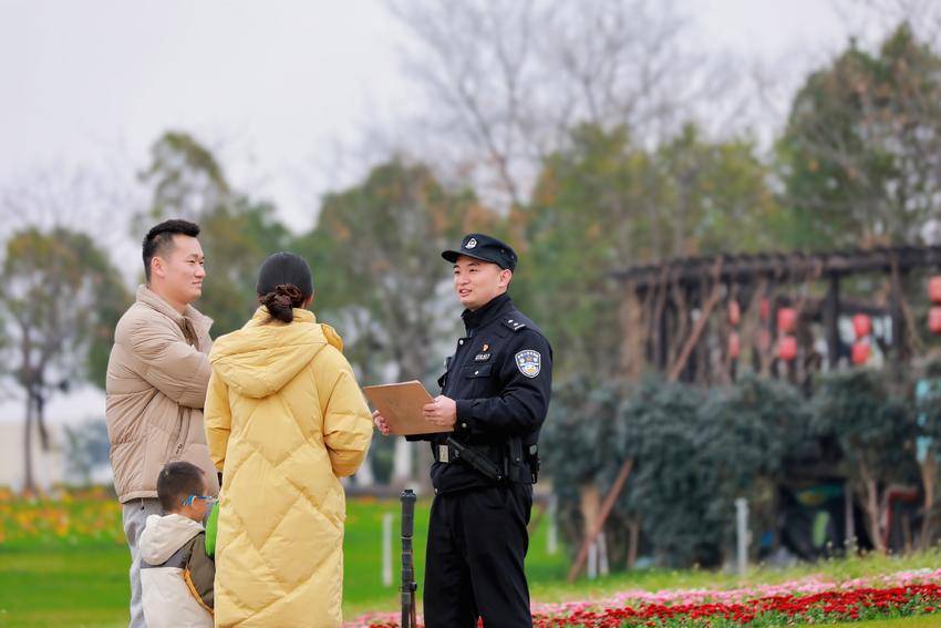 巡逻间隙,执勤民警还化身“安全宣传员”,将反诈、防火、防走失、文明游览等宣传资料,一一递到游客手中。“大姐,陌生链接不要点,免费礼品不要要,谨防诈骗!”“小朋友,不要在花田边追逐打闹,跟紧爸爸妈妈哦!”一句句暖心提醒、一次次耐心讲解,让平安知识随春风入心,让游客在赏景的同时,筑牢安全防线。