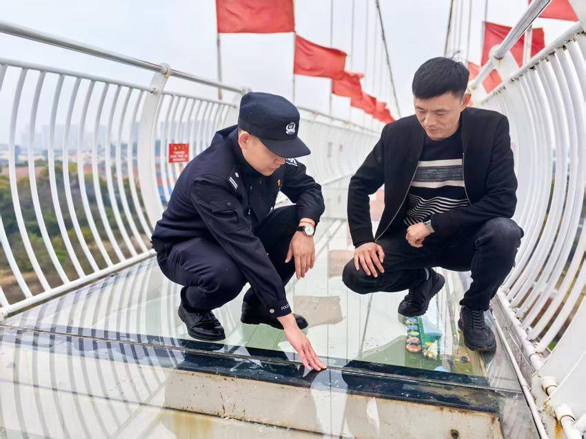 “玻璃天桥的复检报告再给我看一下,拉锚的拉力数据、玻璃的承重检测,每一项都不能有疏漏。”3月24日,大集街派出所社区警务队队长李斌拉着花博汇景区游乐项目负责人,对景区网红玻璃天桥开展安全专项检查。这座150米长、近20米高的玻璃天桥,是景区最热门的打卡点之一,游客玩得尽兴,民警们却始终把安全弦绷到最紧。