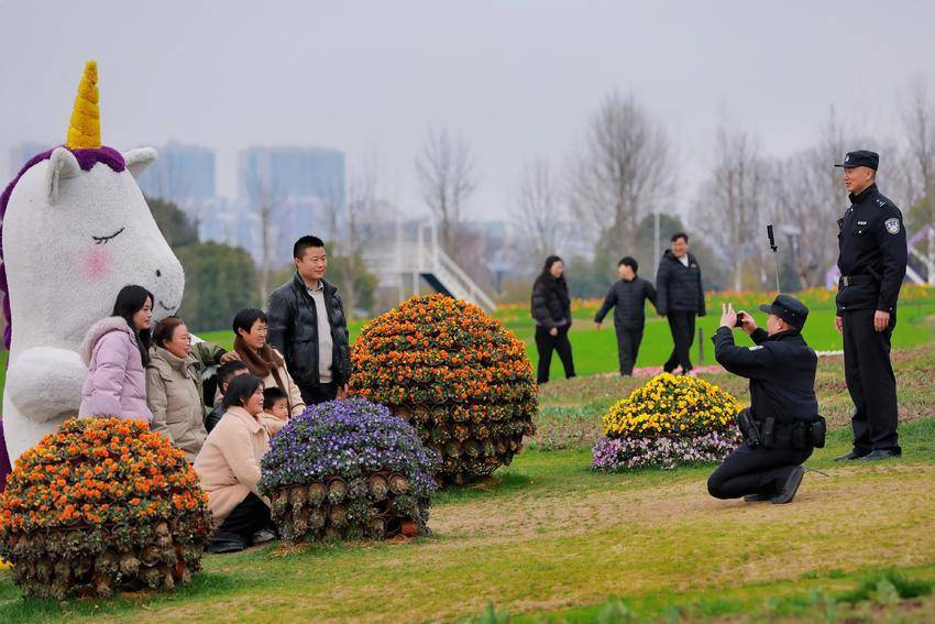 又是一年三月天,武汉市蔡甸区花博汇景区的万千繁花如期绽放。层层叠叠的花田铺就锦绣画卷,蜿蜒曲折的游览小径串联起处处靓景,游客从四面八方赶来,踏春赏景、打卡留影,共赴这场浪漫的春日之约。武汉市公安局蔡甸区分局大集街派出所民辅警穿梭于人潮之中,驻守在花田小径、打卡点位,让“警察蓝”与“花海色”交相辉映。