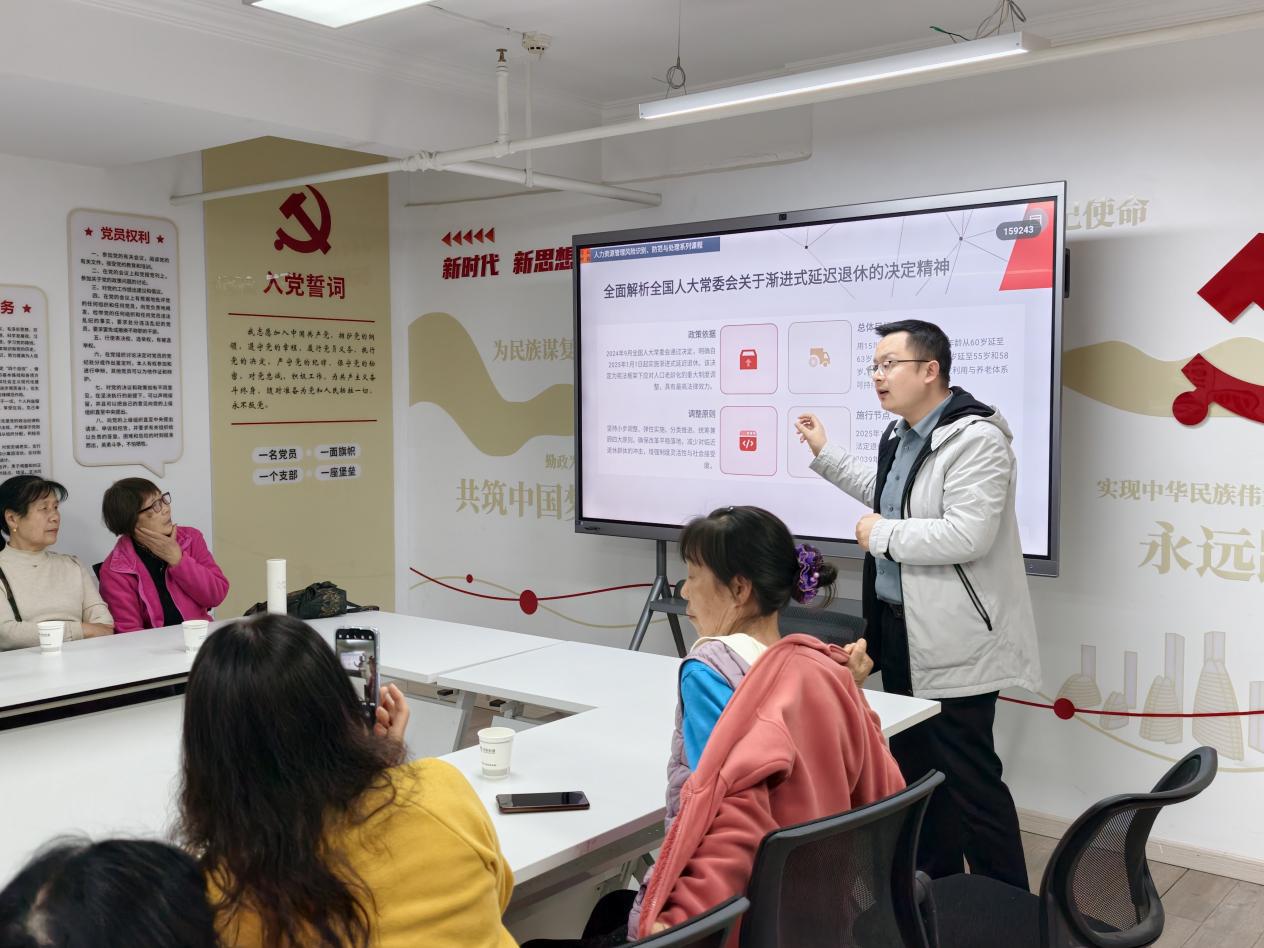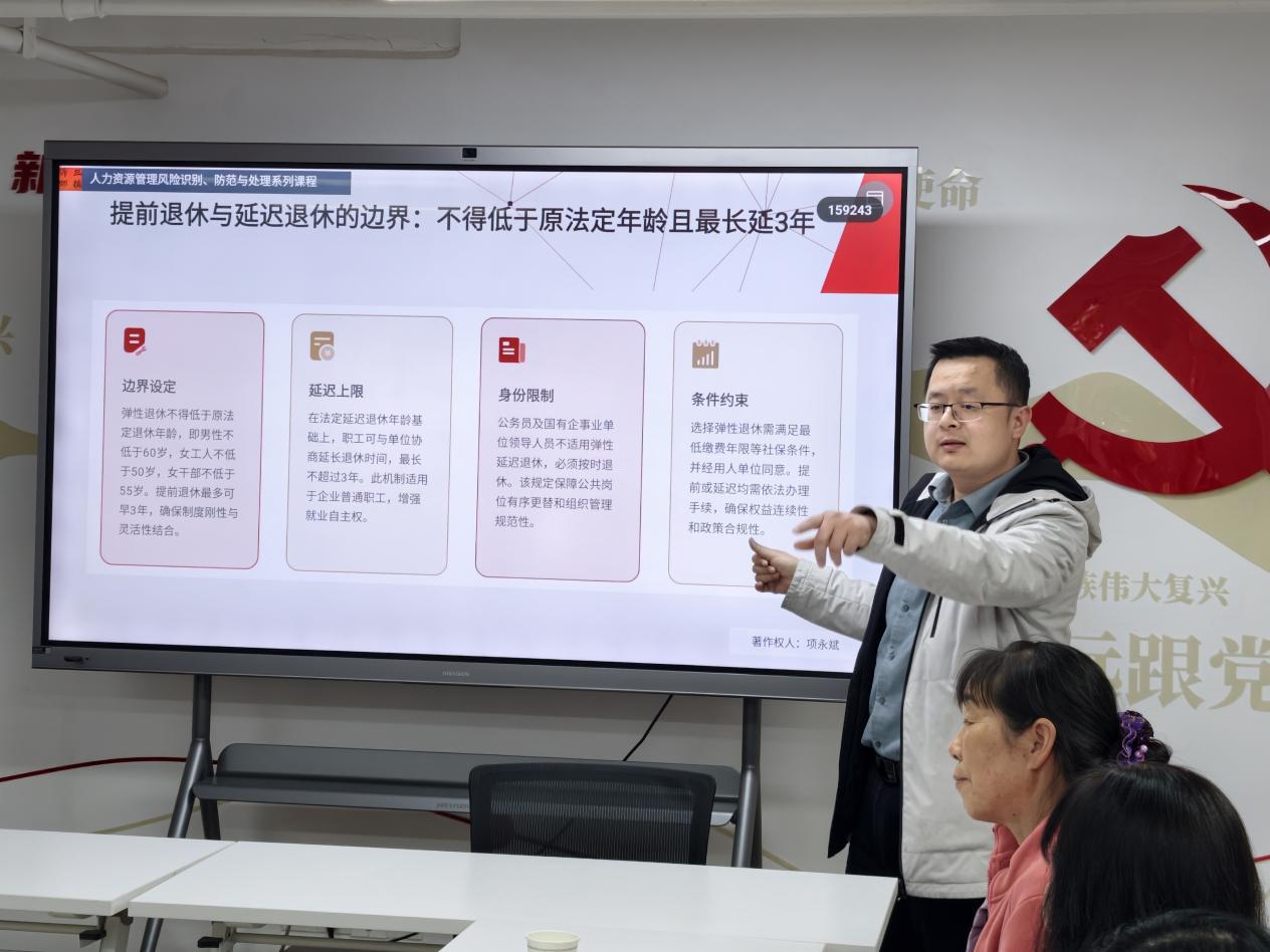 结合政策实施要求,项律师重点讲解了延迟退休的核心标准——男职工、女职工退休年龄的渐进延迟节奏,明确从2025年1月1日起,男职工法定退休年龄逐步延至63周岁,女职工分别从50周岁、55周岁逐步延至55周岁、58周岁的具体推进方式。同时,针对居民关心的弹性退休机制、养老金最低缴费年限调整、特殊工种提前退休条件等热点问题,结合真实案例细致解读,清晰说明弹性提前退休、协商延迟退休的操作范围,以及养老金“长缴多得、晚退多得”的激励政策,把抽象的政策条文转化为通俗易懂的实务指南。
