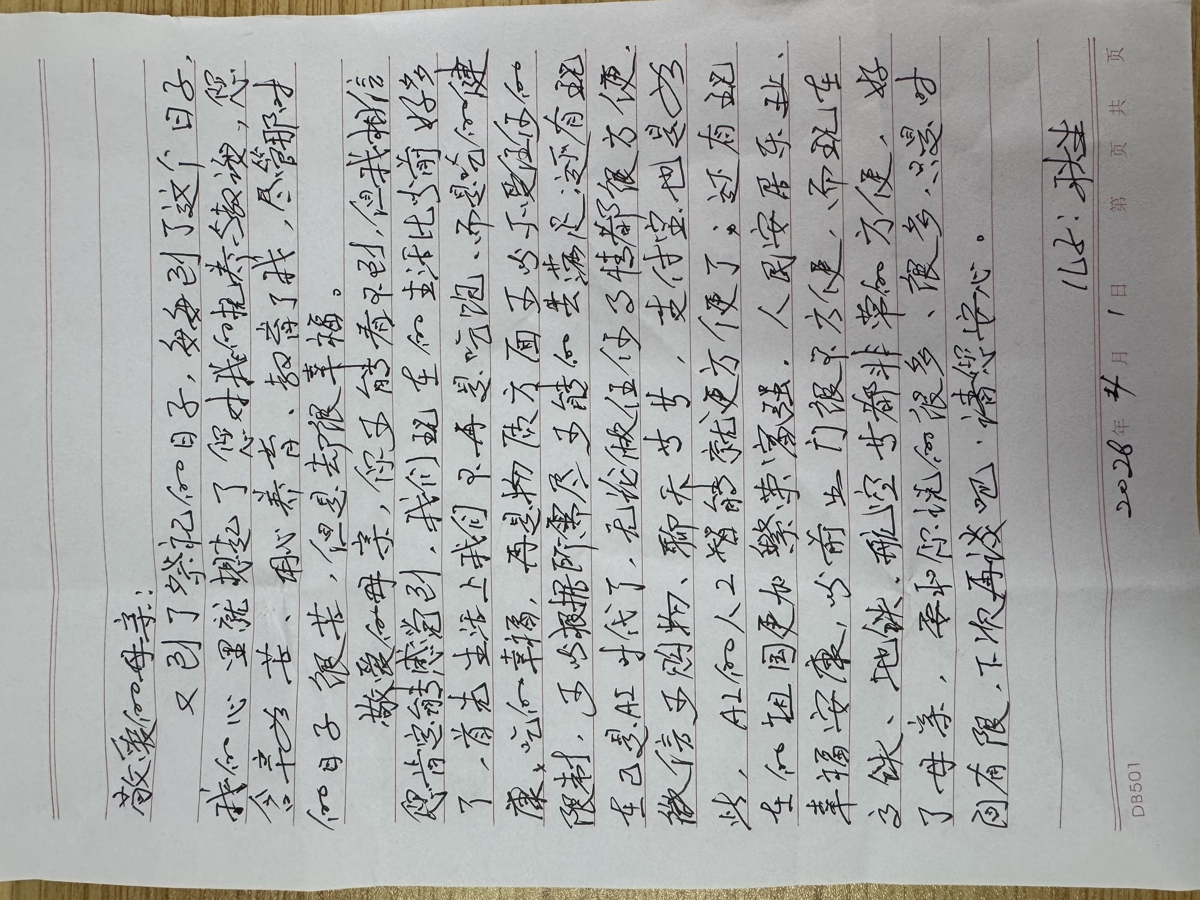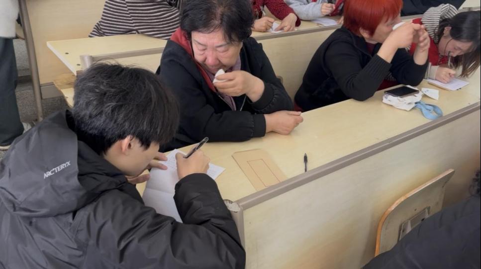 几位不会写字的老人,由大学生志愿者耐心代笔。老人一字一句地诉说,志愿者一笔一画地记录。一位老人在讲述与已故老伴的点滴时,声音哽咽,泪水悄然滑落。志愿者轻轻握住她的手,默默陪伴。那一刻,纸短情长,字字千钧。