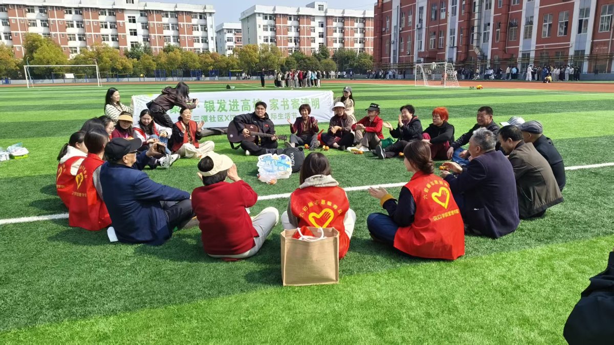 春日的午后,长者们与大学生围坐在草坪上,共享一场别开生面的“操场歌会”。老人们教唱《我的祖国》《茉莉花》,学生们则带来《少年》《起风了》。当两代人共同唱起《光阴的故事》时,歌声中满是岁月的沉淀与青春的回响;合唱《送别》时,不少人眼中泛起泪光——既是对逝者的追思,也是对彼此相遇的珍重。